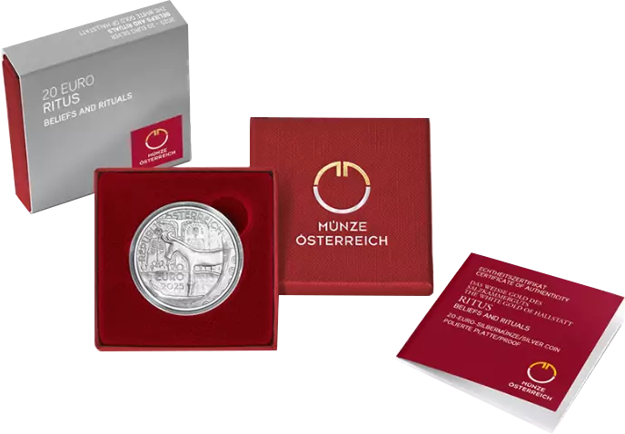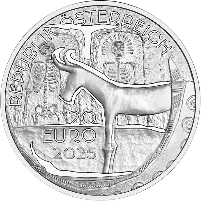 In the foreground of the obverse of the coin is a bowl decorated with a bull, one of the remarkable artefacts unearthed in the Hallstatt cemetery, symbolised in the background by a pair of skeletons. Inspired by the artistic representations found on Iron Age bronze vessels known as situlae, the reverse of the coin shows, in the foreground, the image of a ritual in which a prostrate person is blessed or anointed by another who is standing. In the background, beyond those supporting the ritual and a blazing fire, a water bird is depicted. Because of its great importance, salt also played a role in the rituals. Valuable objects were sacrificed, including ?white gold?.