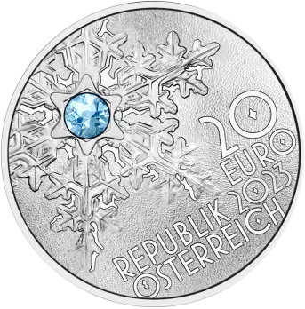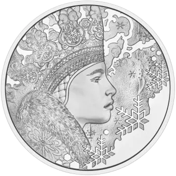 The obverse of the coin features an enlargement of a snow crystal with a glacier-blue gemstone at its centre and polished edges. The reverse of the coin depicts a young woman in profile. A manifestation of winter, she is a snow princess adorned with a crown and cloak, both adorned with snow crystals. The background is partially polished around the crown and on the lower right-hand side.