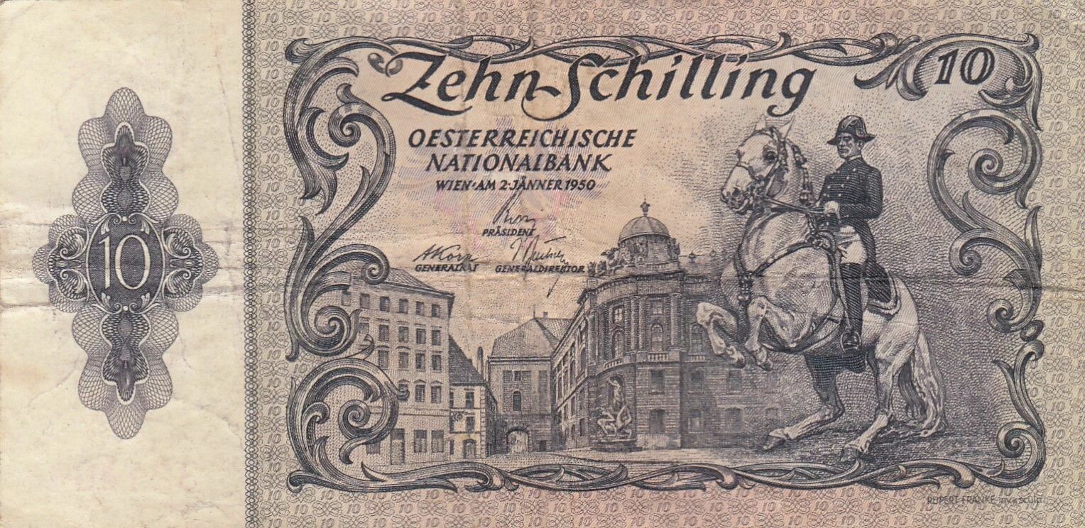 Au recto, le billet présente un cavalier de l'école d'équitation espagnole, figurant devant la Hofburg, un complexe de bâtiments historiques à Vienne. Les inscriptions comprennent la valeur nominale "10" ainsi que "Zehn Schilling". On y trouve également le nom de l'institution émettrice, "OESTERREICHISCHE NATIONALBANK", et la date d'émission "WIEN, AM 2 JÄNNER 1950". Les mentions "PRÄSIDENT", "GENERALRAT" et "GENERALDIREKTOR" sont également présentes, suivies de la signature "RUPERT FRANKE inv. et sculp.", indiquant que Rupert Franke est à la fois l'inventeur et le sculpteur de ce motif. Le nom de Franke Rupert est également mentionné en tant que graveur et dessinateur.