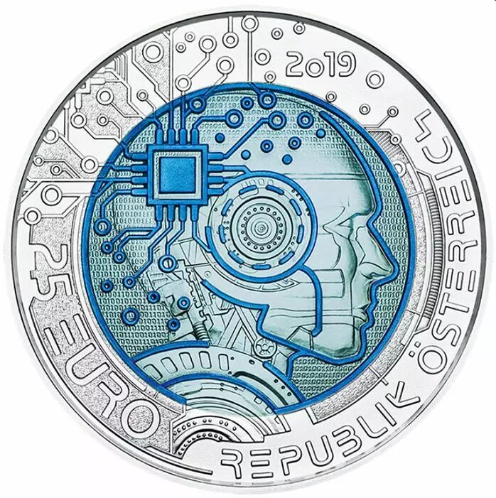 Le développement des intelligences artificielles nous mènent vers un avenir à la fois fascinant et inconnu. Le revers de la pièce présente le contour d'une tête qui symbolise notre ignorance sur le fonctionnement futur de cette super intelligence " humanoïde. Le fait est que nous ne savons pas ce qui se passera quand l'intelligence artificielle aura trouvé comment s'améliorer et ne dépendra plus de nous. Va-t-il nous emprisonner ou nous libérer ? La nouvelle pièce au millésime 2019 de la série best-sellers des 20 euros Argent Niobium d'Autriche met à profit son cœur de niobium (bleu électrique cette année) pour mettre en lumière l'incertitude humaine.