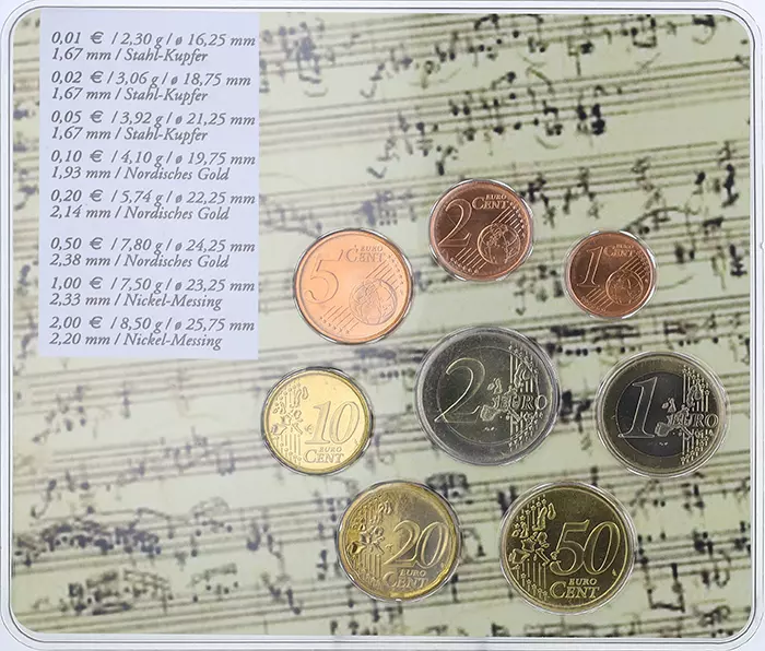 Les pièces en euro de l'Autriche ont toutes des dessins différents avec un thème commun pour chacun des trois types. Les pièces de 1 2 et 5 centimes représentent des fleurs autrichiennes les pièces de 10 20 et 50 centimes des bâtiments de la capitale de l'Autriche Vienne et les pièces de 1 et 2 euros des autrichiens célèbres (Bertha von Suttner et Wolfgang Amadeus Mozart).