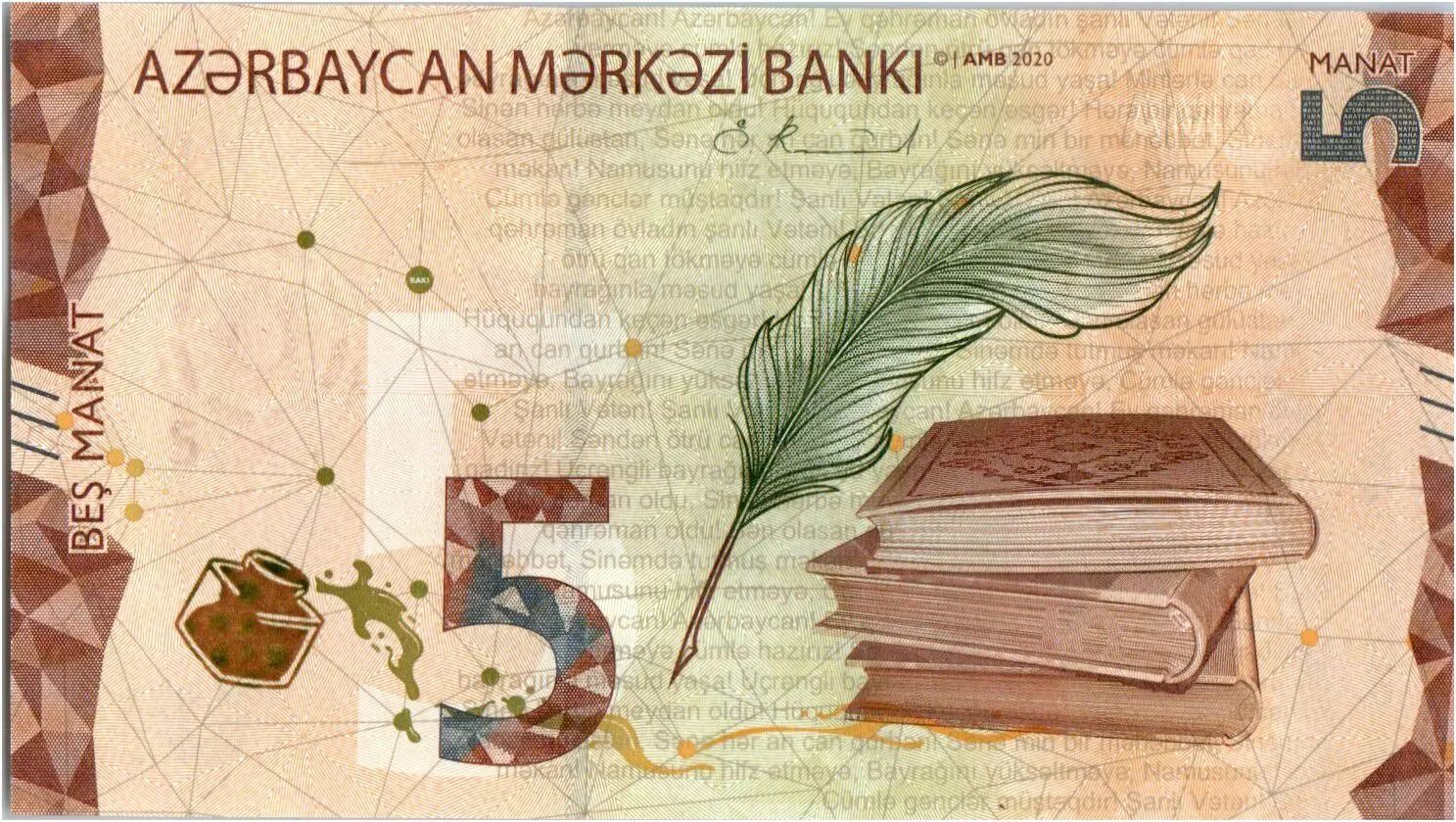 Billet Azerbaidjan 5 Manat - Livre, statues, carte - 2020 - Neuf