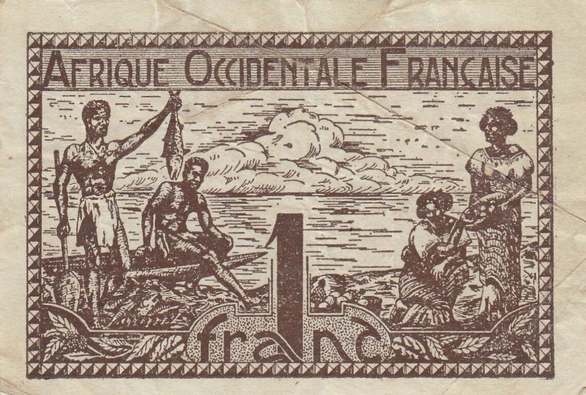 Ce billet de 1 franc, émis par la Banque de l'Afrique Occidentale, date de 1944. Il s'inscrit dans une série de billets de nécessité émis durant la période de la Seconde Guerre mondiale. Il présente un design artistique géométrique distinctif.