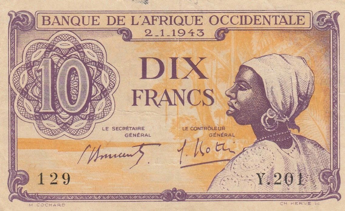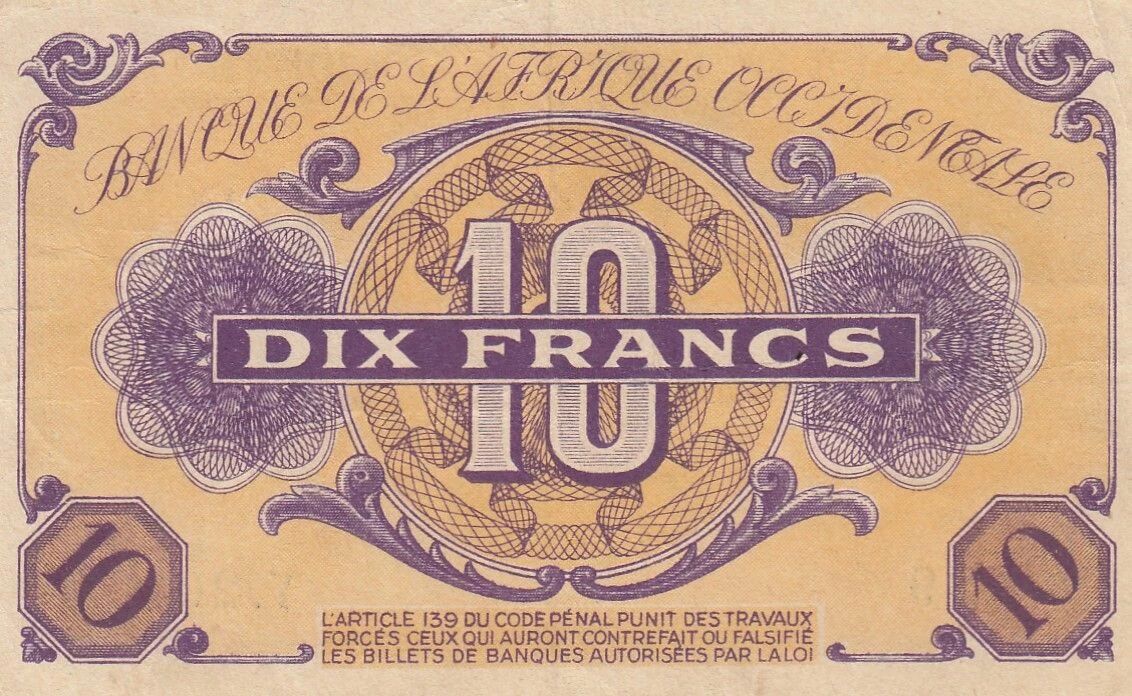 Ce billet de banque de 10 francs a été émis par la Banque de l'Afrique Occidentale Française (B.A.O) en 1943. Il appartient à la série Y.