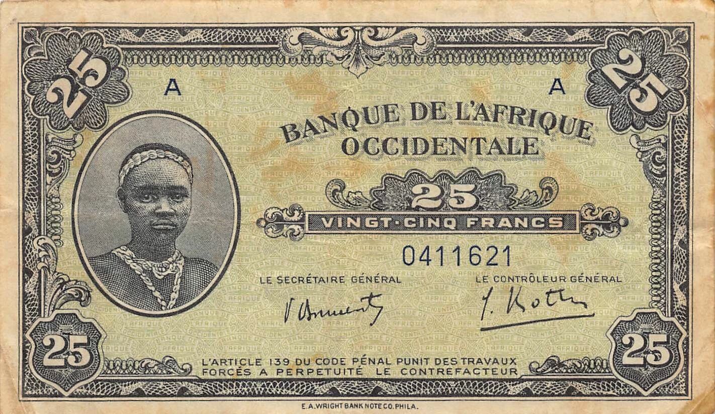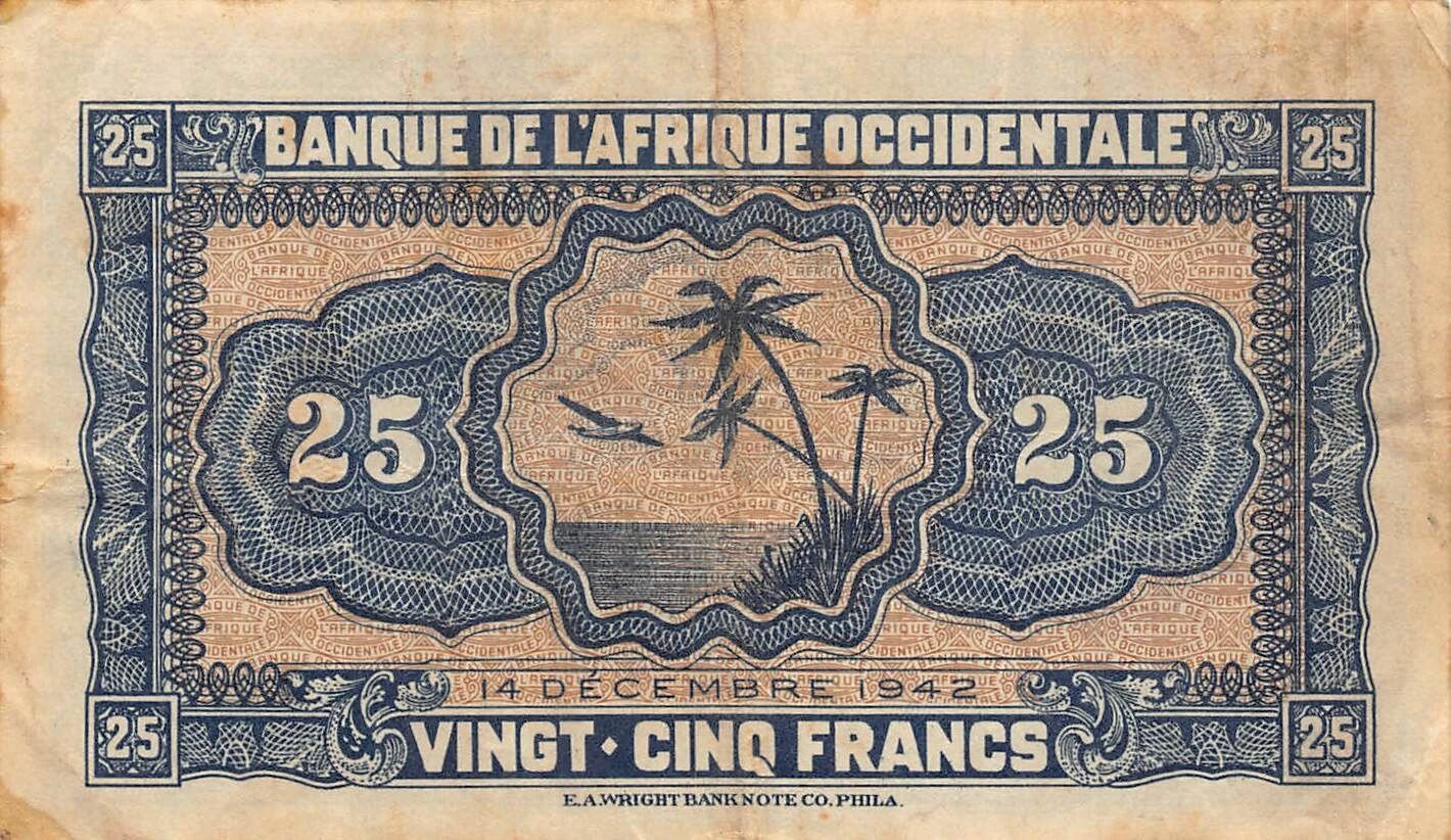 Accueil > Billets du Monde > Billets d'Afrique > Banque de l'Afrique Occidentale > B A O 25 Francs - Africaine - 14-12-1942 - P.30