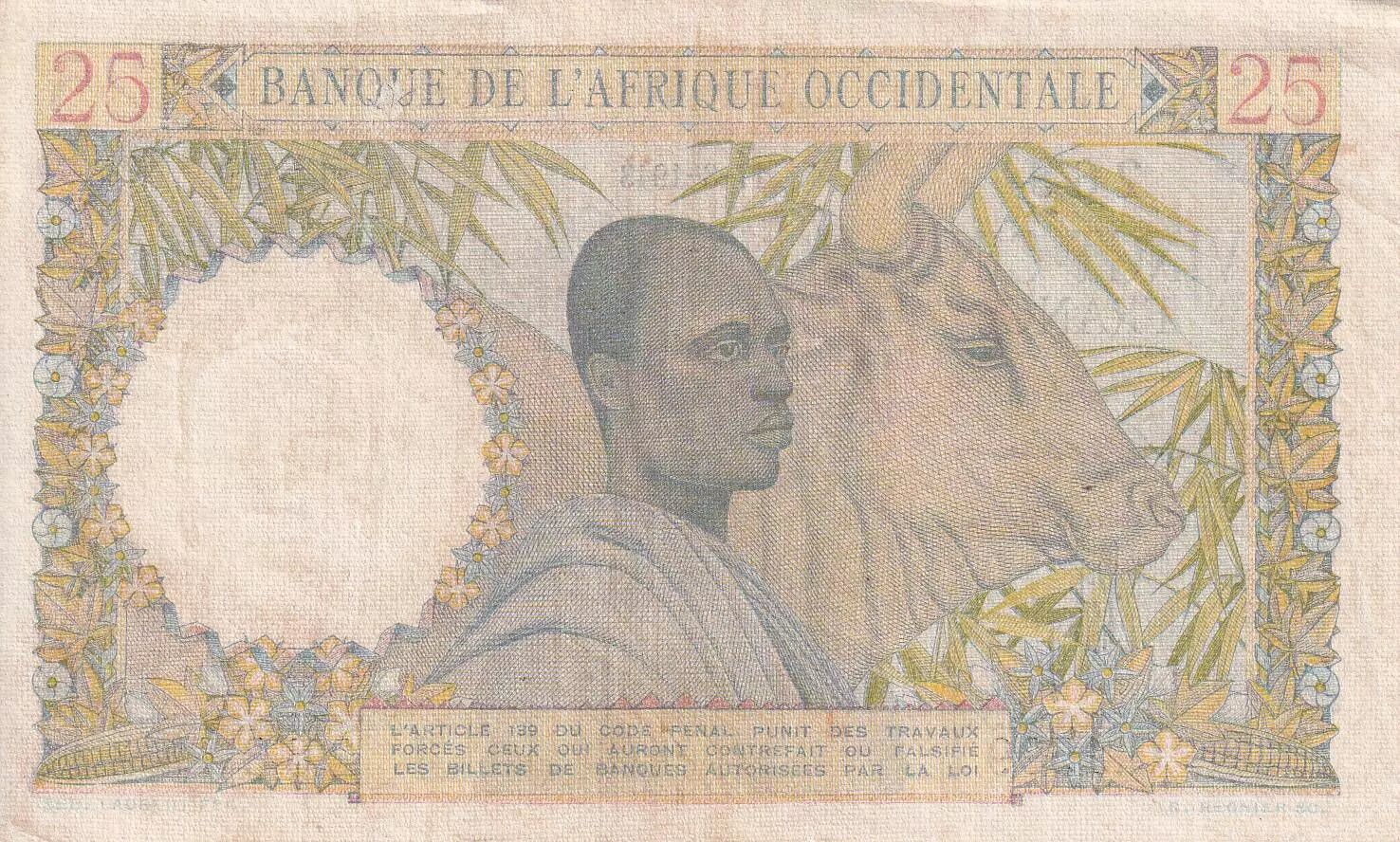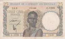 Accueil > Billets du Monde > Billets d'Afrique > Banque de l'Afrique Occidentale > B A O 25 Francs - Femme, homme avec vache - 1943 - Série C.1599 - TTB+ - P.38