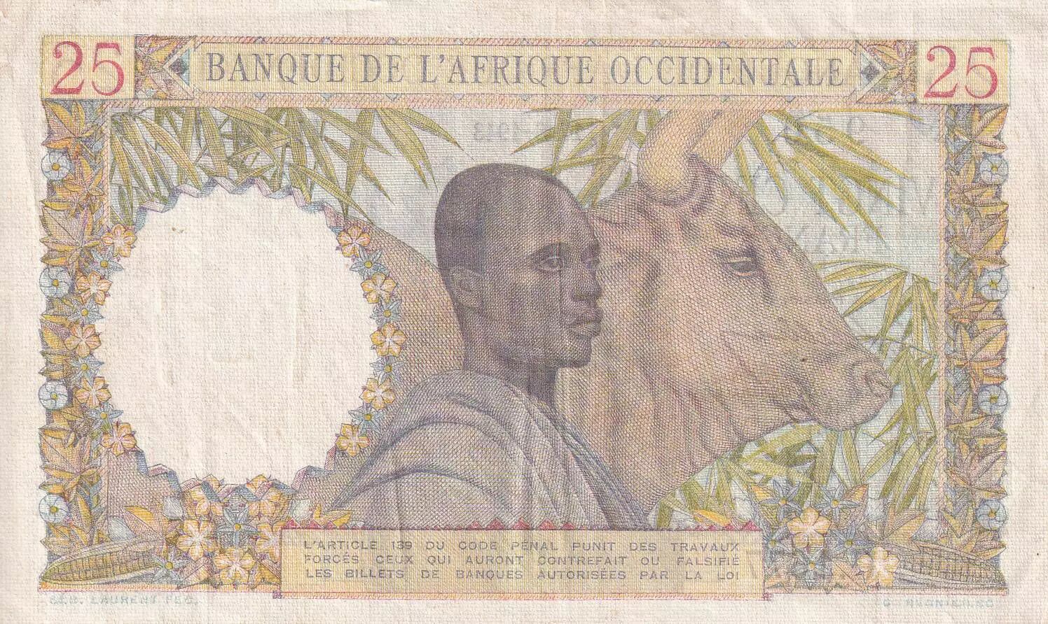 Accueil > Billets du Monde > Billets d'Afrique > Banque de l'Afrique Occidentale > B A O 25 Francs - Femme, homme avec vache - 1943 - Série U.1677 - TTB+ - P.38