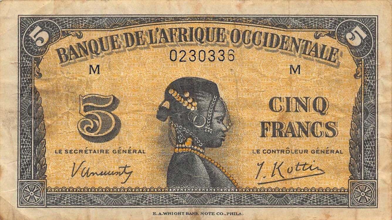 Accueil > Billets du Monde > Billets d'Afrique > Banque de l'Afrique Occidentale > B A O 5 Francs - Africaine - 14-12-1942 - P.28a