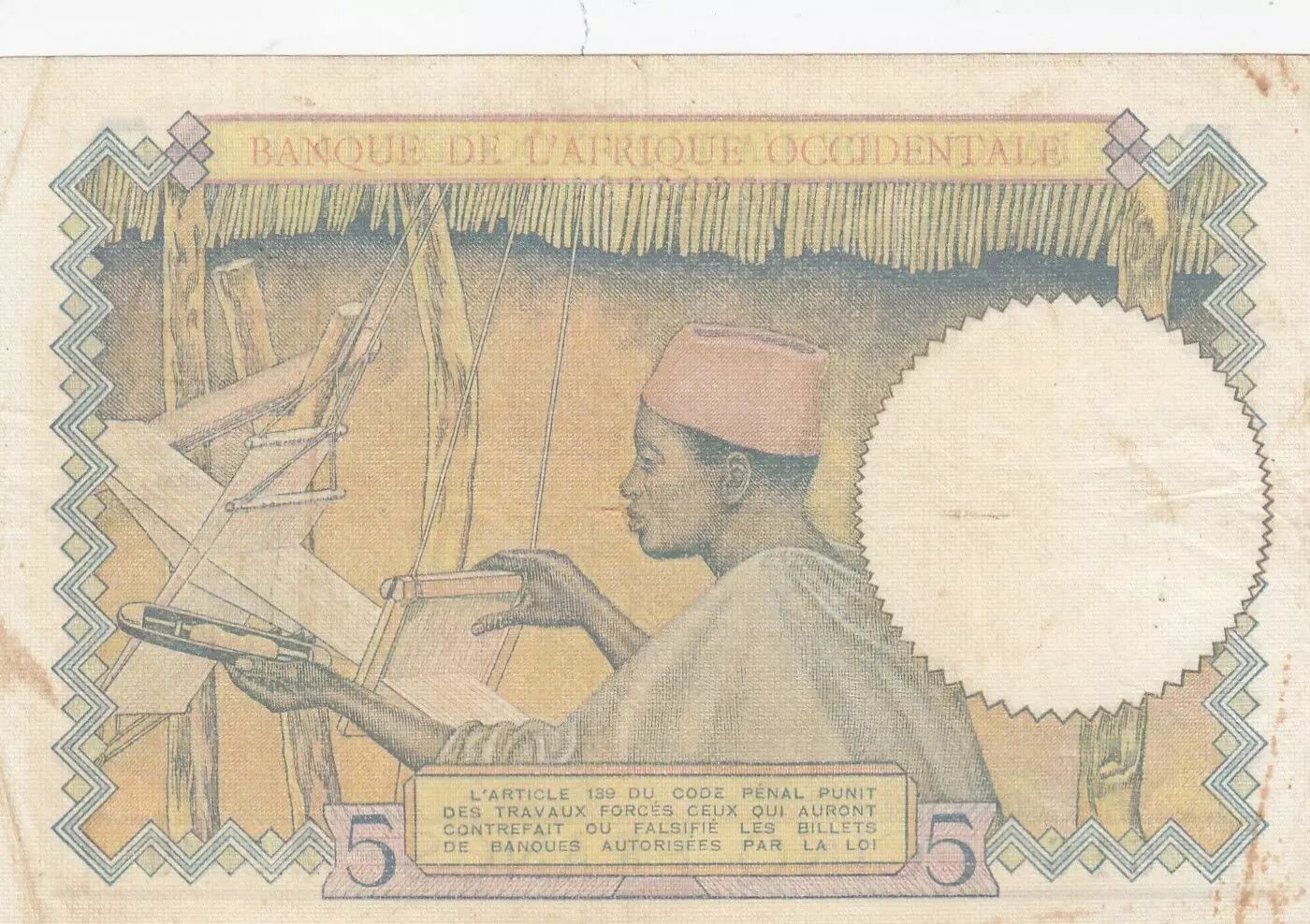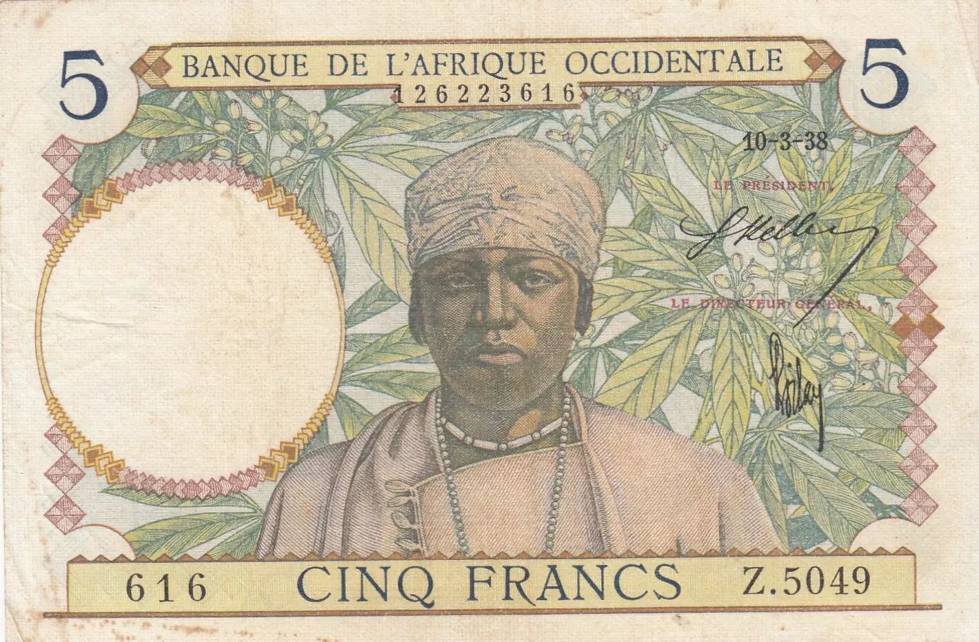 Accueil > Billets du Monde > Billets d'Afrique > Banque de l'Afrique Occidentale > B A O 5 Francs - Caféier - Tisseran - 10-03-1938 - Série Z.5049 - TTB+ - P.21