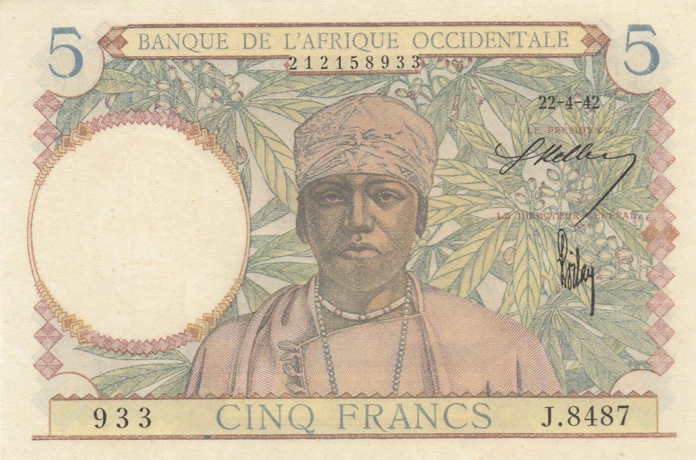 Le billet de 5 francs de la Banque de l'Afrique Occidentale, émis le 22 avril 1942, présente des caractéristiques visuelles distinctes sur ses deux faces.
