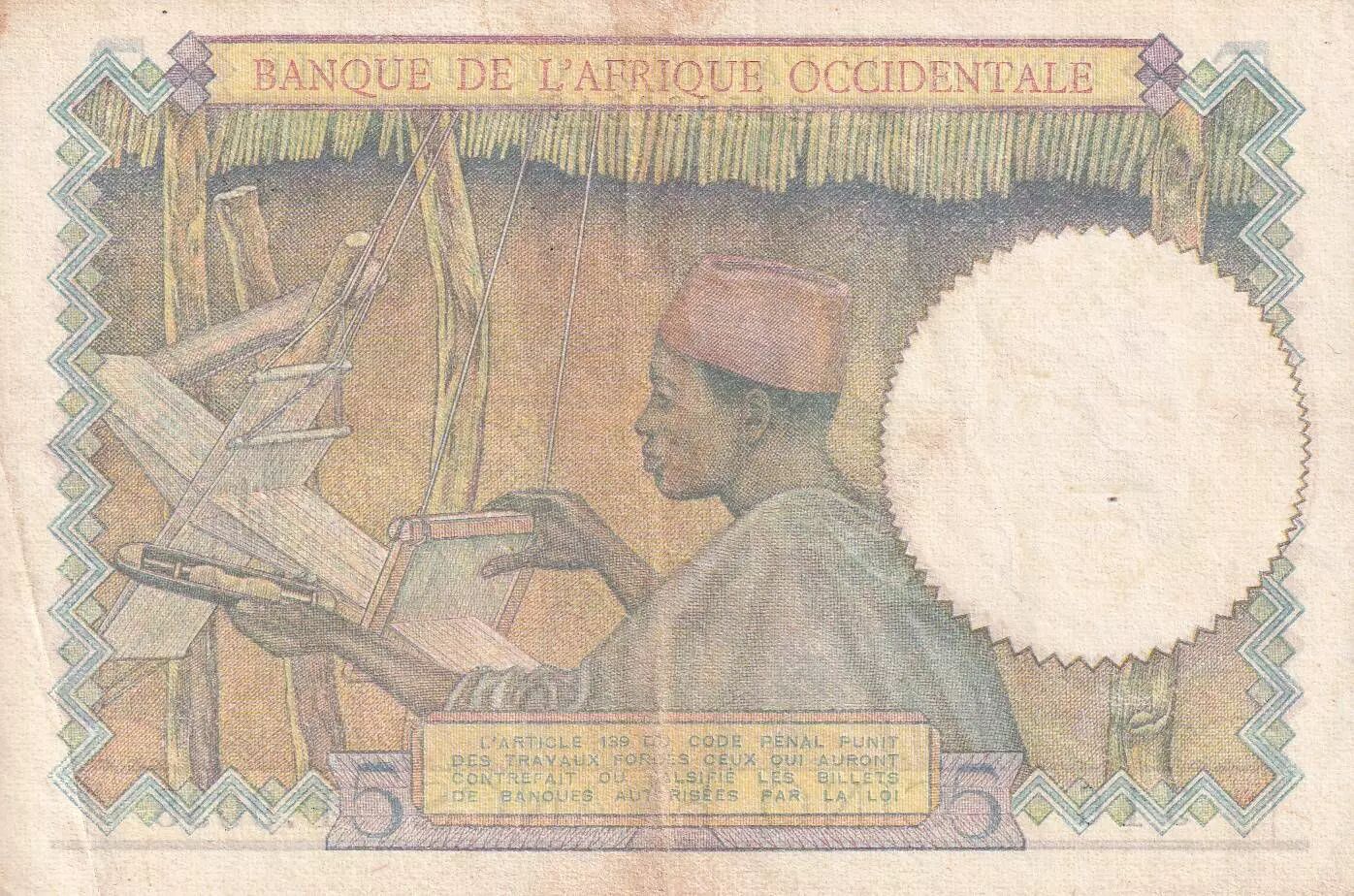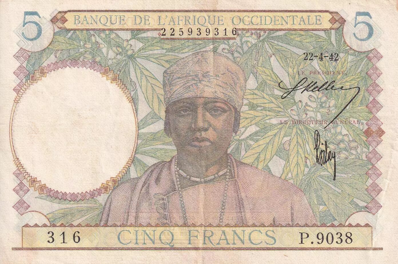Accueil > Billets du Monde > Billets d'Afrique > Banque de l'Afrique Occidentale > B A O 5 Francs - Caféier - Tisseran - 22-04-1942 - Série P.9038 - SUP - P.25