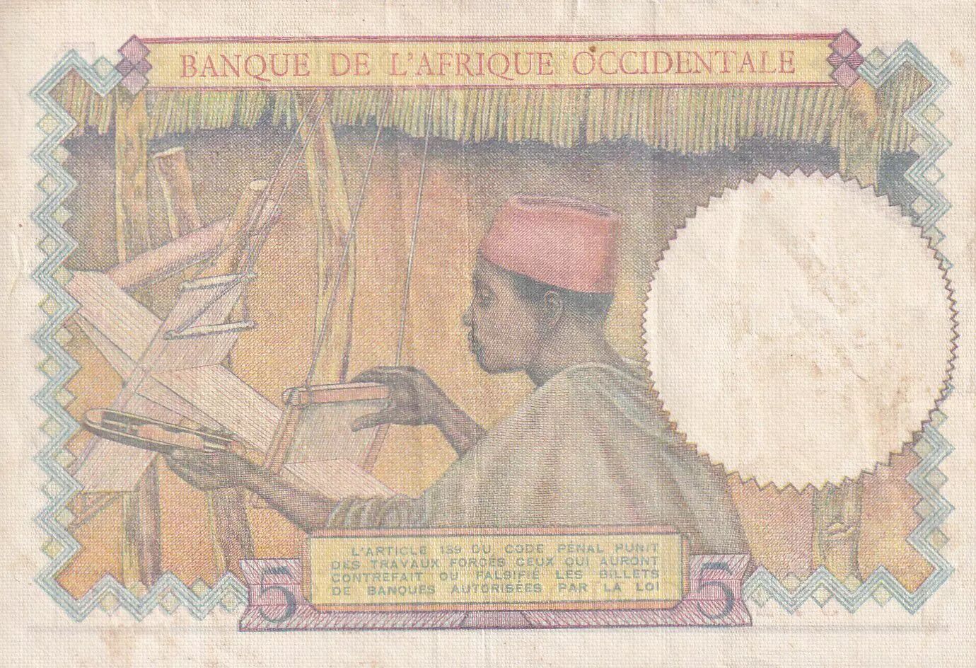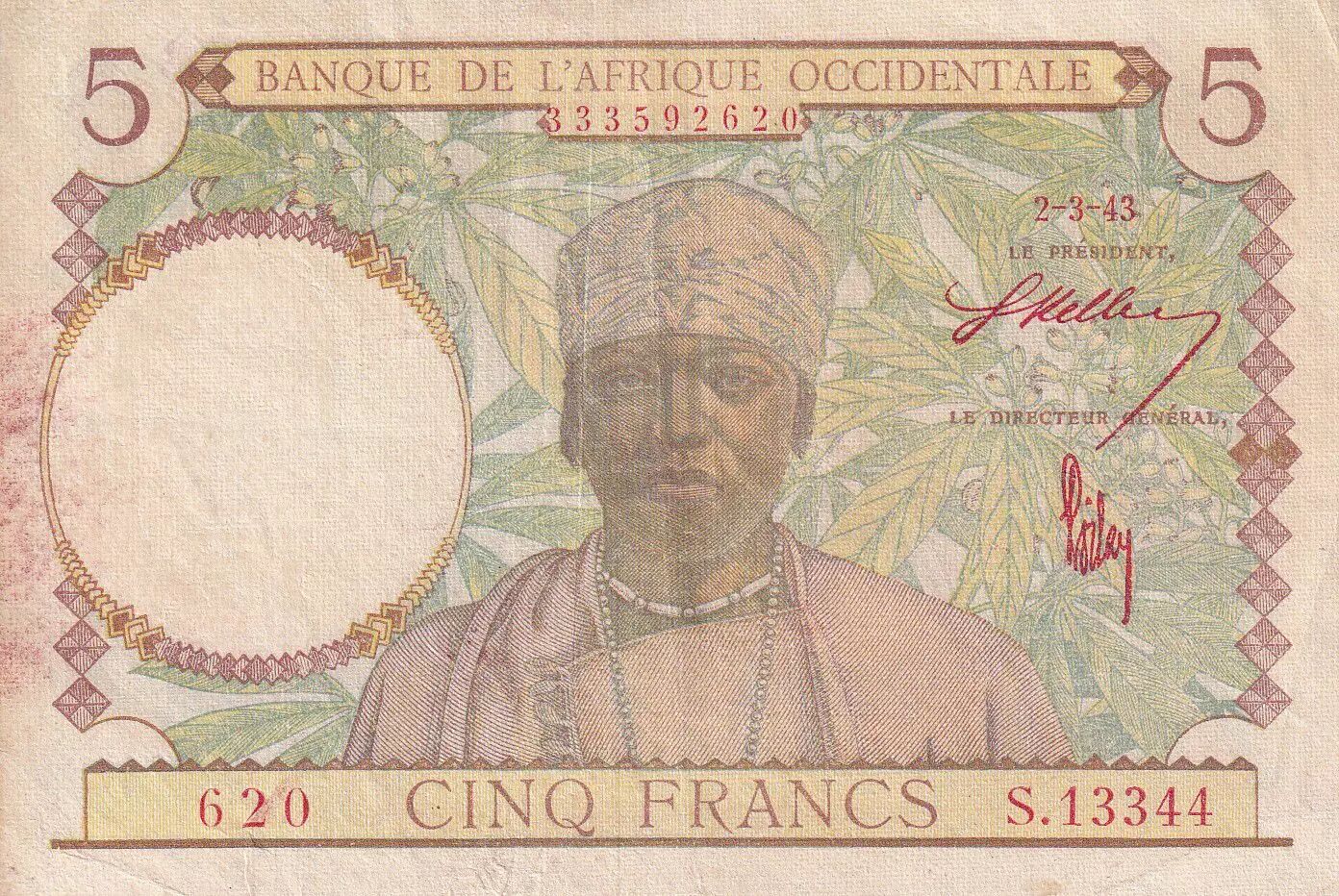 Accueil > Billets du Monde > Billets d'Afrique > Banque de l'Afrique Occidentale > B A O 5 Francs - Caféier - Tisseran - Chiffres rouges - 1943 - Série S.13344 - TTB+ - P.26