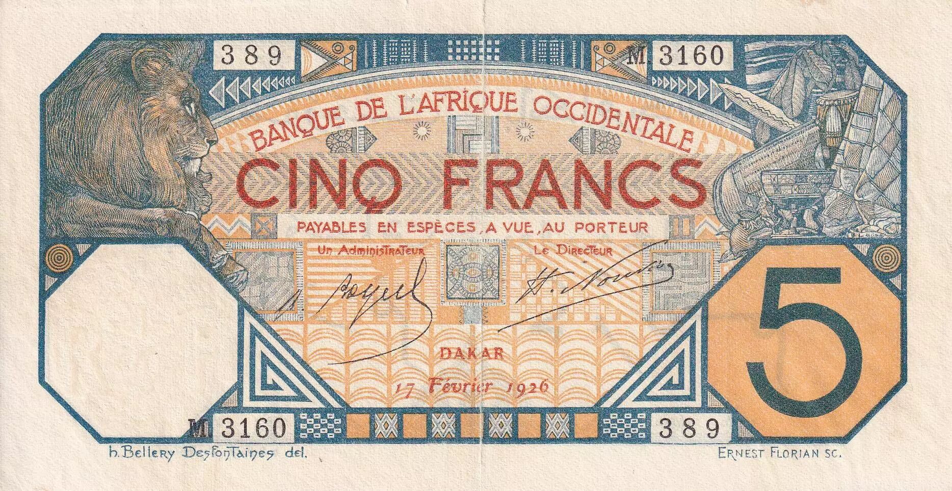 Accueil > Archivage > archivage-Billets du Monde > B A O 5 Francs - Dakar - 17-02-1926 - Série M 3160 - PSUP- P.5Bc