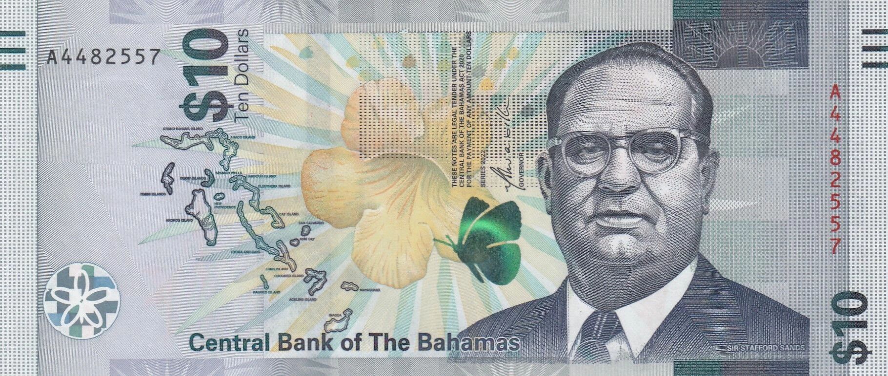 The 2022 Bahamian 10-dollar banknote features distinctive iconography and advanced security features. This banknote is part of Series A.