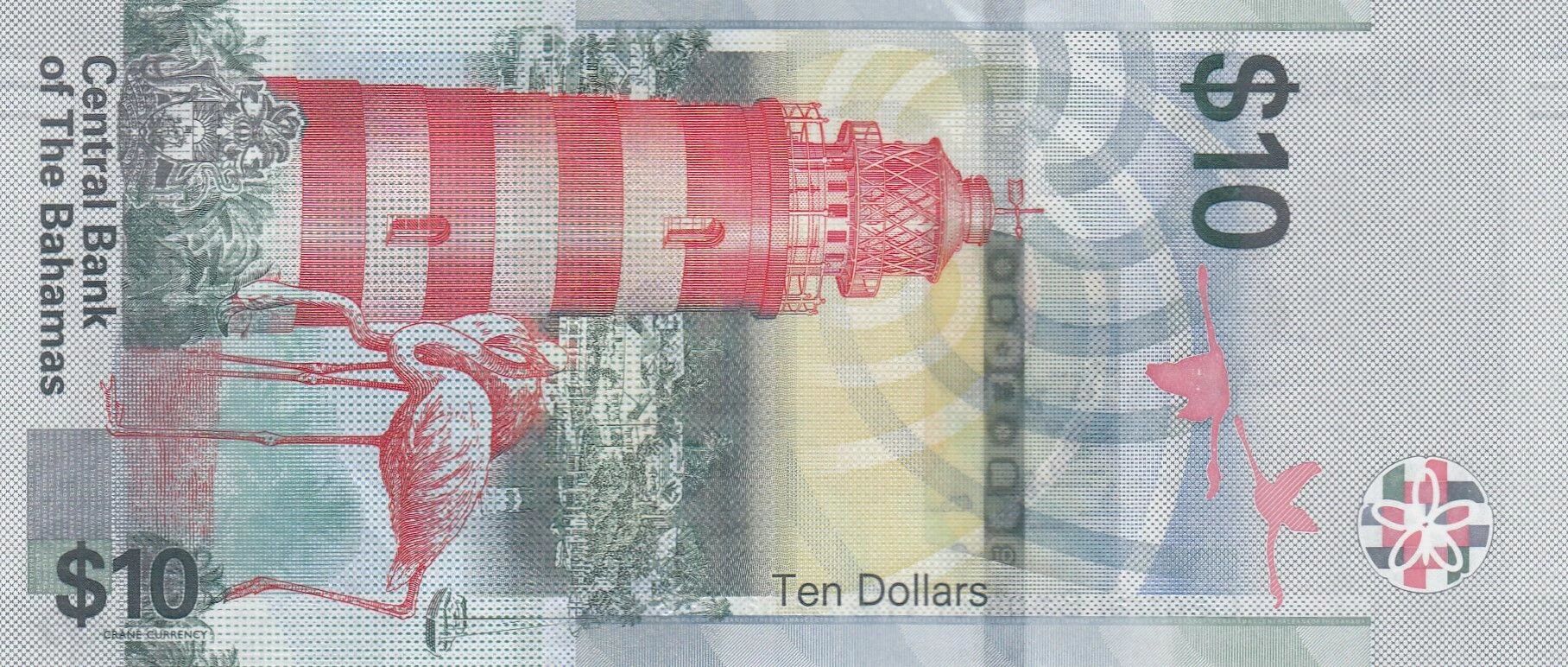 On the back of the banknote, a representation of the lighthouse is visible. The lighthouse is an important maritime symbol for the Bahamas, reflecting the importance of navigation and the sea in the country's history and economy. The landscape surrounding the lighthouse is depicted with particular attention to detail, illustrating the natural beauty of the Bahamas.