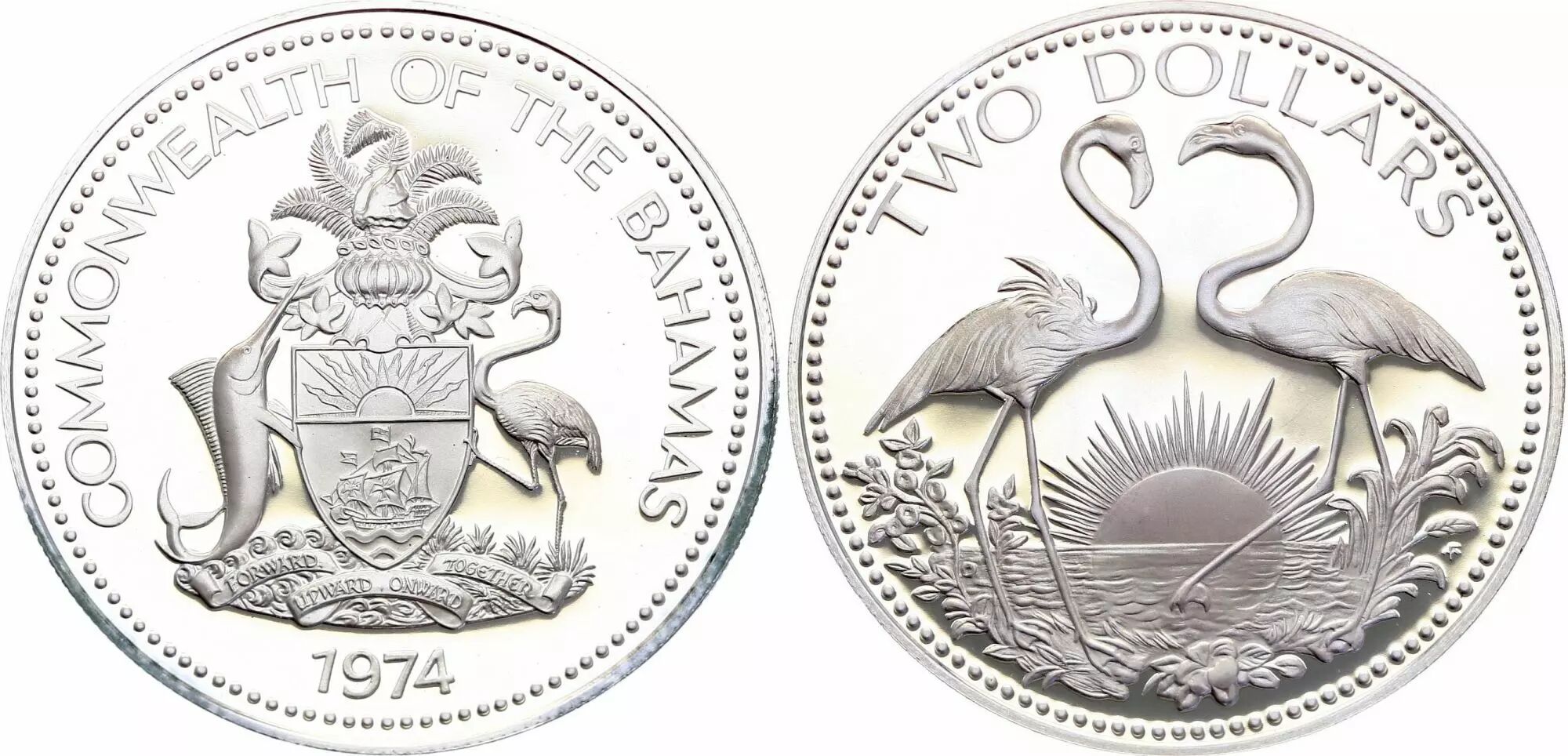 Pièce Bahamas 2 Dollars - Flamands roses - 1974 - Argent - Frappe BE