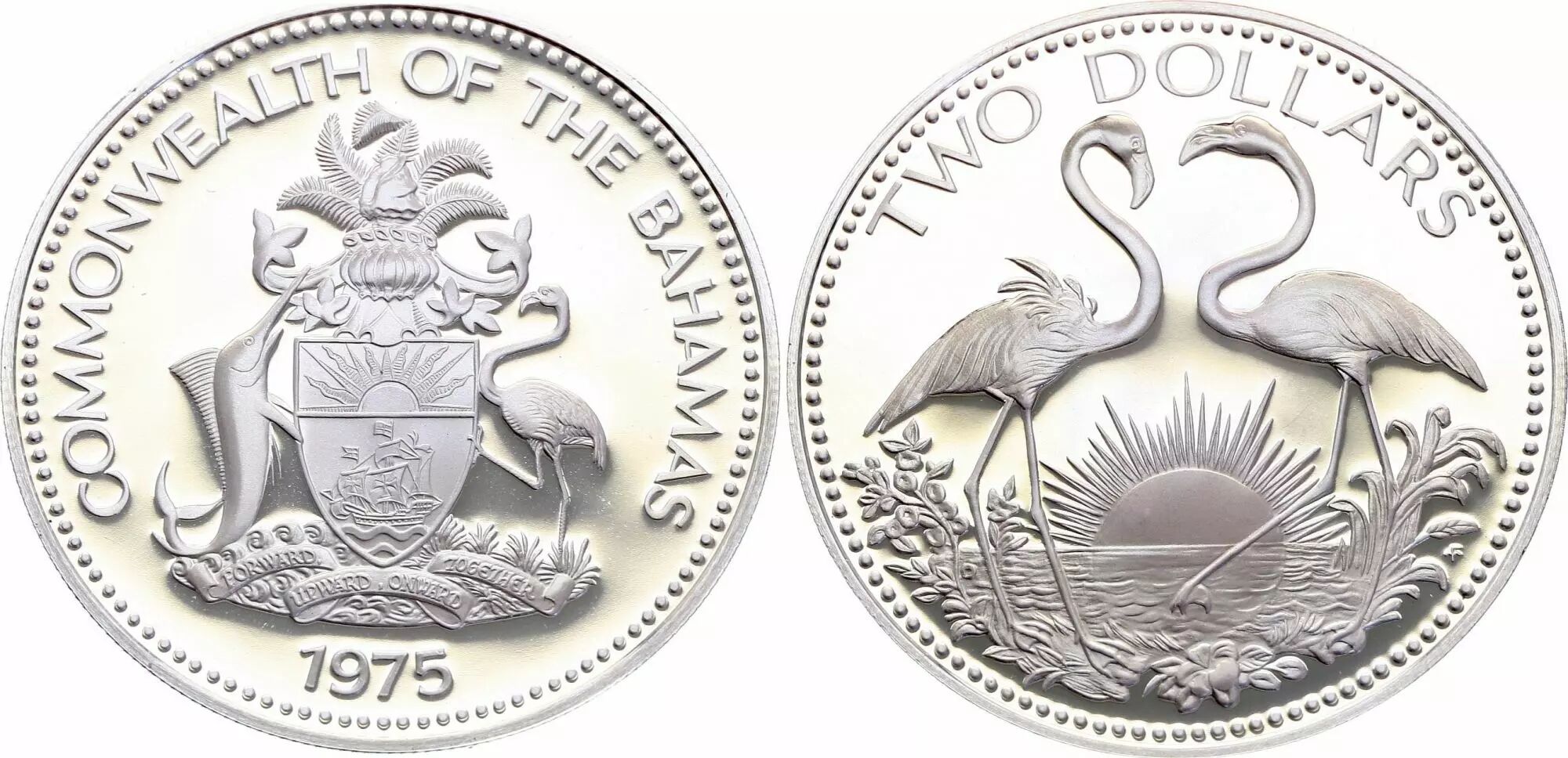 Pièce Bahamas 2 Dollars - Flamands roses - 1975 - Argent - Frappe BE