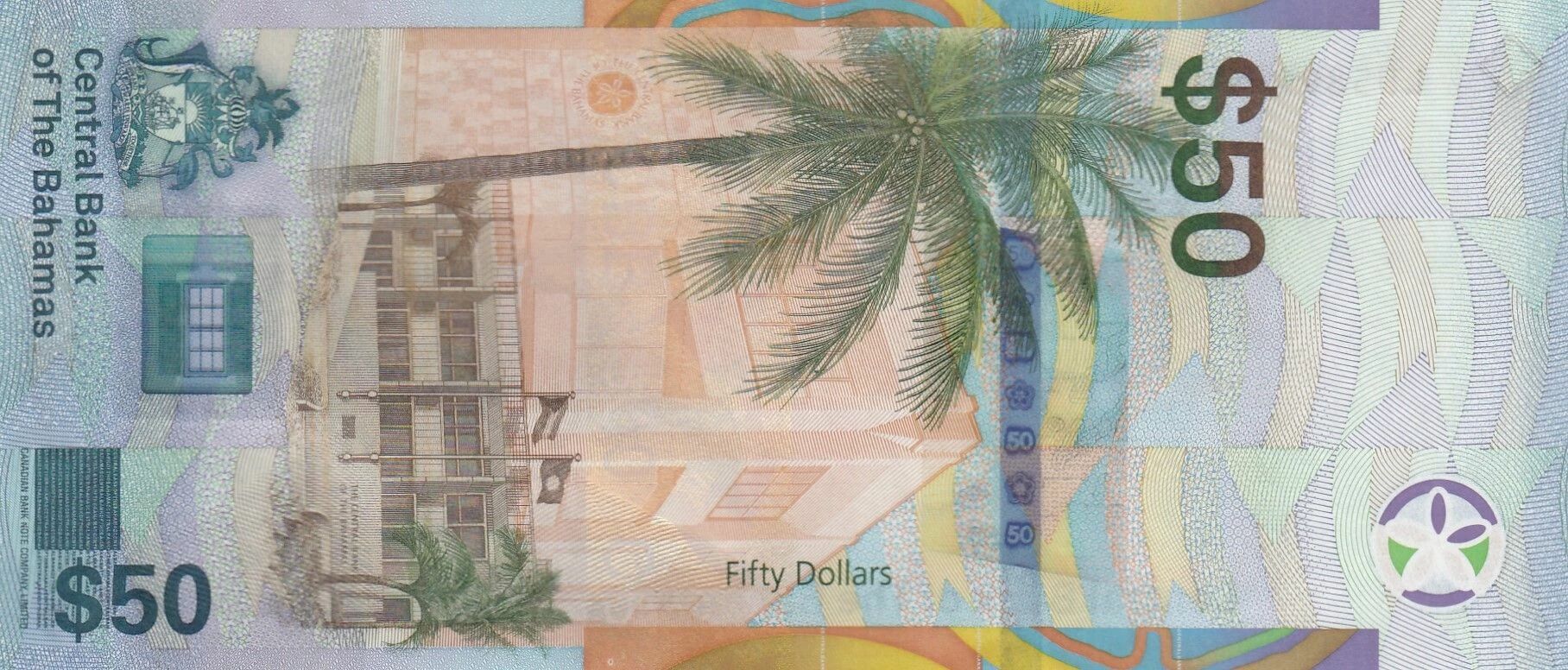The reverse side of the banknote depicts the Central Bank of the Bahamas building. This representation symbolizes financial stability and the importance of the institution in the country's economy. The building's architecture is reproduced with precision, highlighting the details of its design. Ornamental motifs and graphic elements complement the design, adding an aesthetic dimension to the entire banknote.