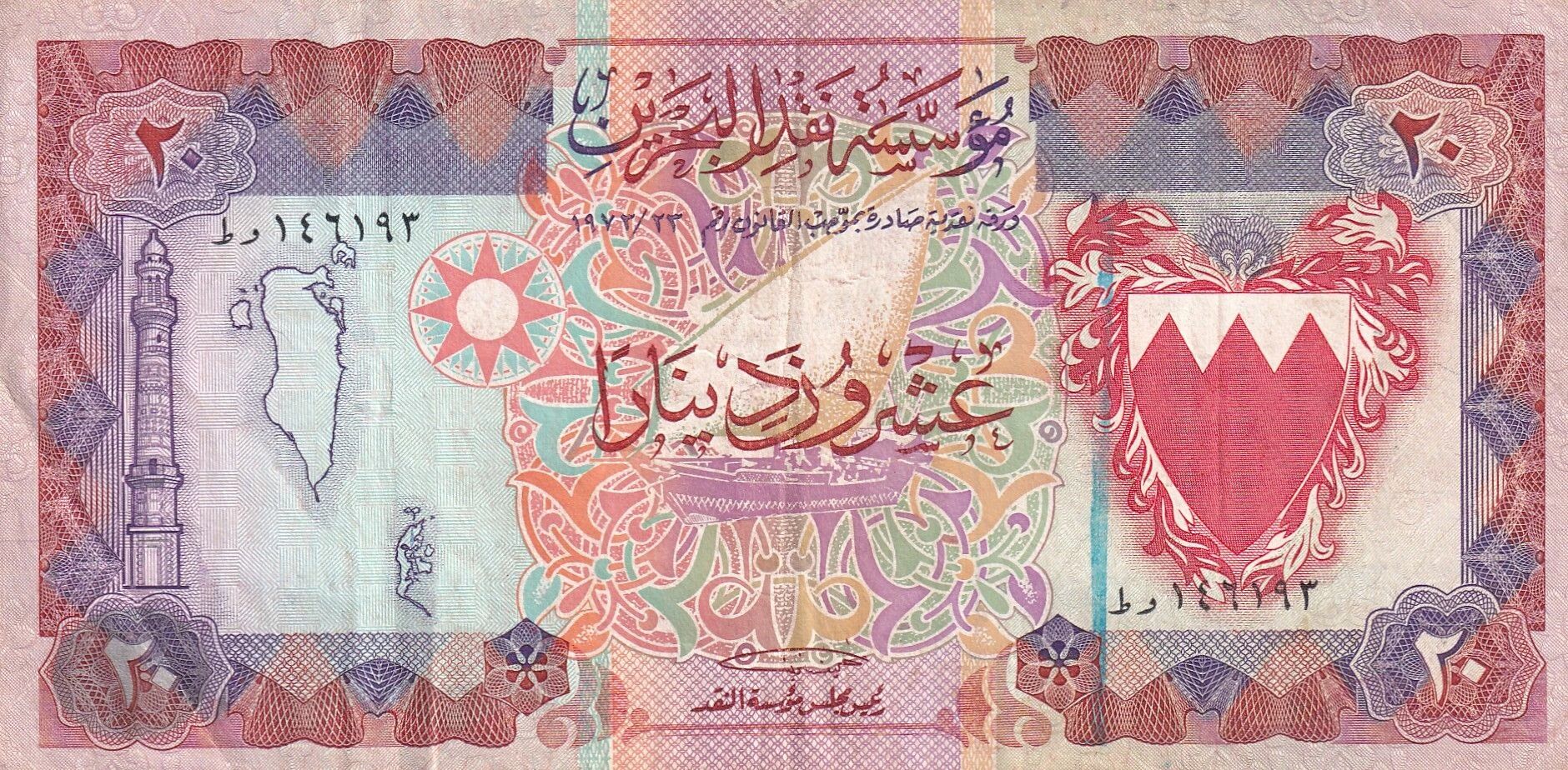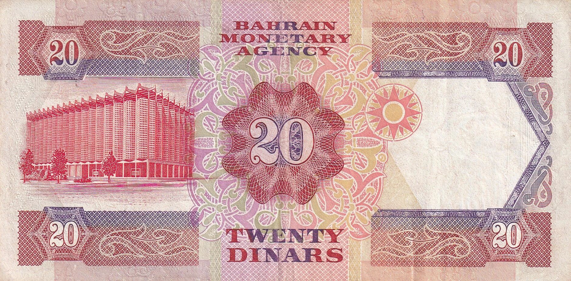 This Bahraini banknote has a face value of 20 dinars. It was issued in 1973.