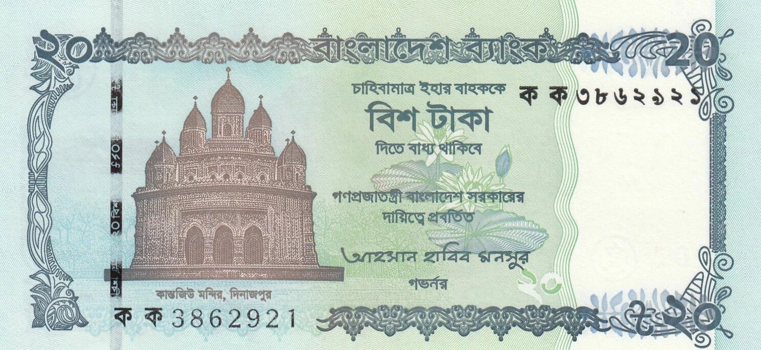 The obverse of the banknote features an image of the Kantjiu Temple, located in Dinajpur, positioned on the left side. The guarantee clause and the face value "twenty taka" are printed in the center of the banknote. A Shapla flower motif, the national flower of Bangladesh, adorns the central background. The face value "20" is repeated in the upper left, upper right, and lower right corners.