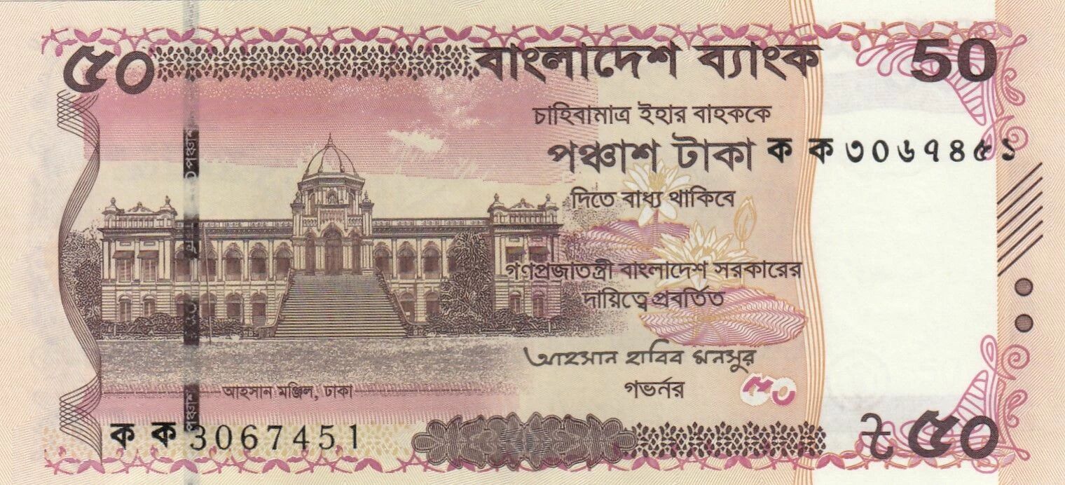 The front of the banknote features an image of Ahsan Manzil, located in Dhaka, on the left side. In the center, the "guarantee clause" relating to the value of fifty taka is printed. The central background of the banknote is adorned with a representation of the national flower "Shapla" in full bloom, accompanied by leaves and buds. The face value "50" is printed in the upper left corner, the upper right corner, and the lower right corner.