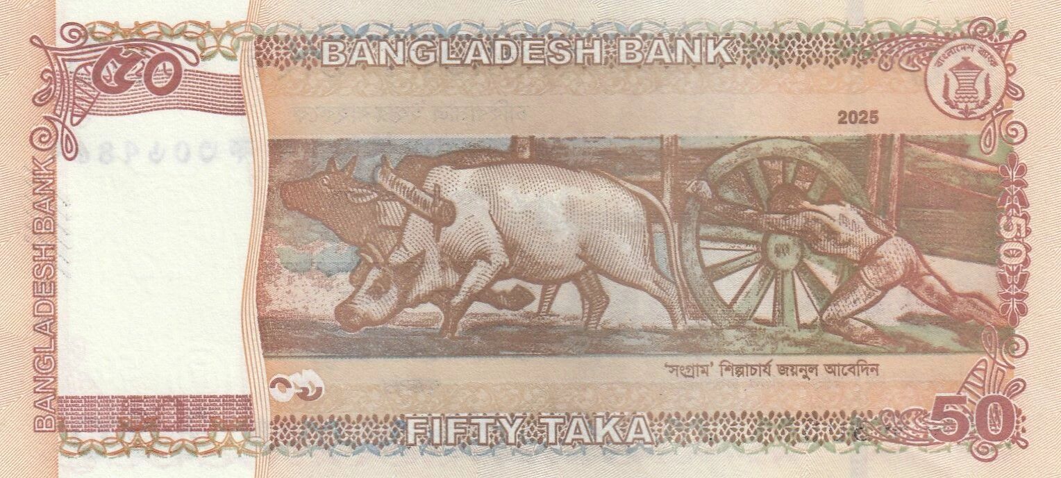 This banknote, with a face value of 50 taka, was issued in Bangladesh in 2025. It measures 130 mm long and 60 mm wide.