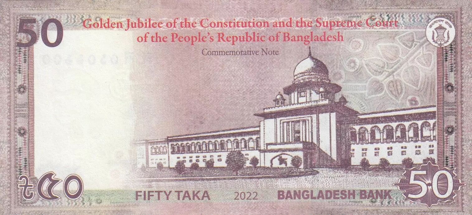 Rose, violet et marron. Avers: texte en bengali ; Sheikh Mujibur Rahman ; le bâtiment du Jatiya Sangsad Bhaban (Parlement national) à Dhaka ; logo du 50e anniversaire. Revers: texte en bengali et anglais ; le bâtiment de la Cour suprême à Dhaka ; logo de la banque. Filigrane de sécurité fenêtré de 2 mm de large avec logo de la banque en dématérialisé et 50. Filigrane : Sheikh Mujibur Rahman sur fond pixelisé et logo de la banque en électrotype et 50. Imprimeur : (Security Printing Corporation). 130 x 60 mm. Papier.