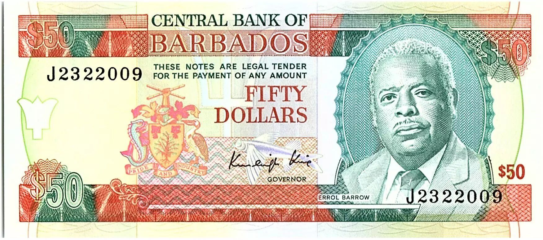 Billet Barbade 50 Dollars, Errol Barrow - Trafalgar square - 1989