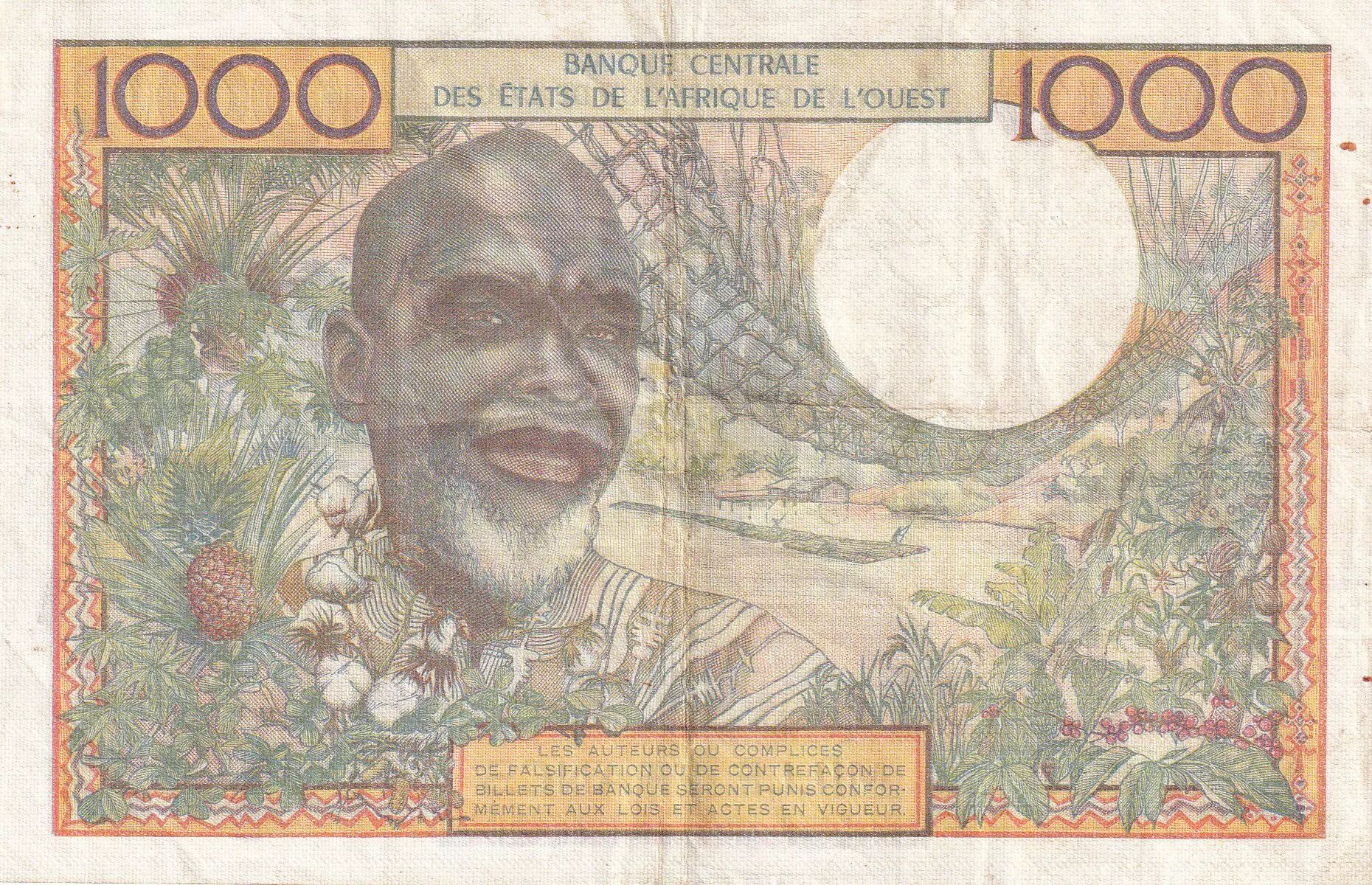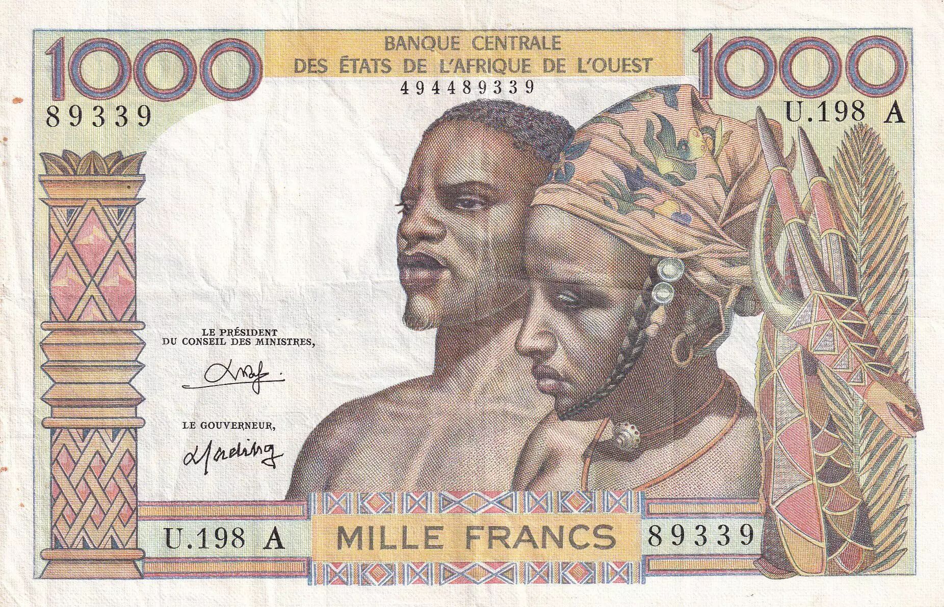 Accueil > Billets du Monde > Billets d'Afrique > Etats de l'Afrique de l'Ouest > BCEAO 1000 Francs - Couple africains - Fleuve - ND (1959-1965) - Lettre A (Côte d'Ivoire) - Série U.198 - P.103An