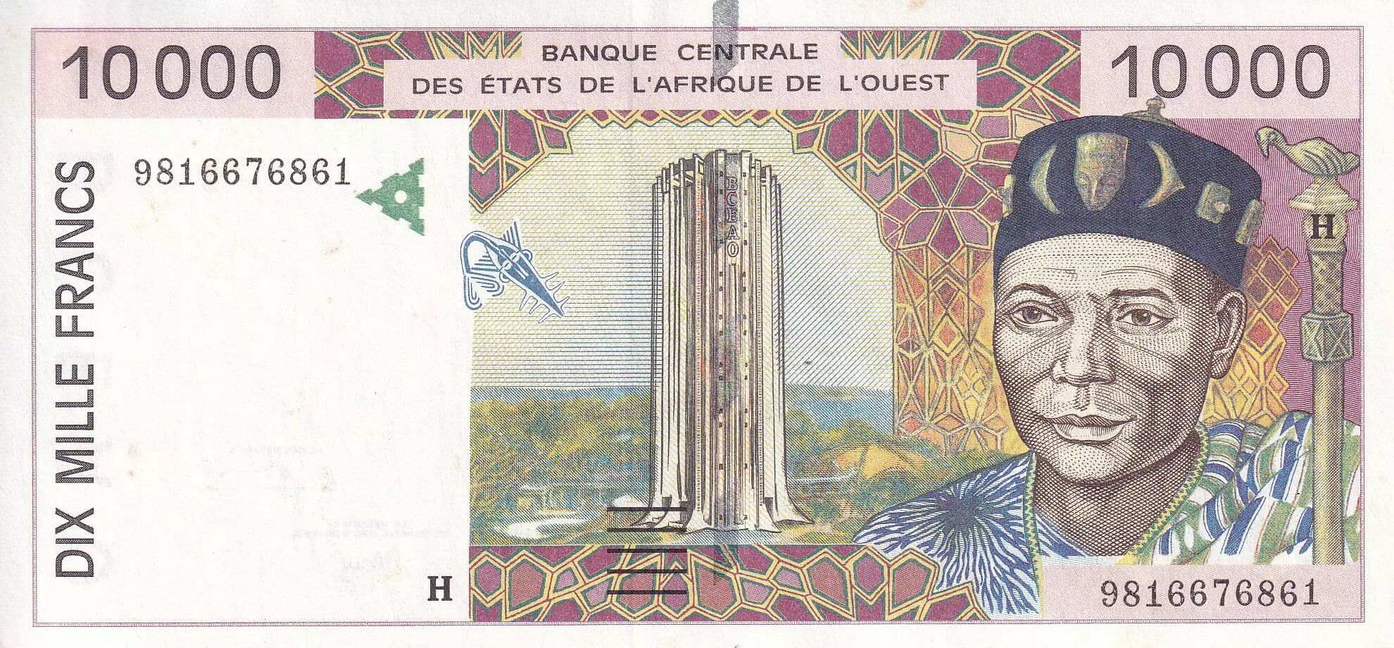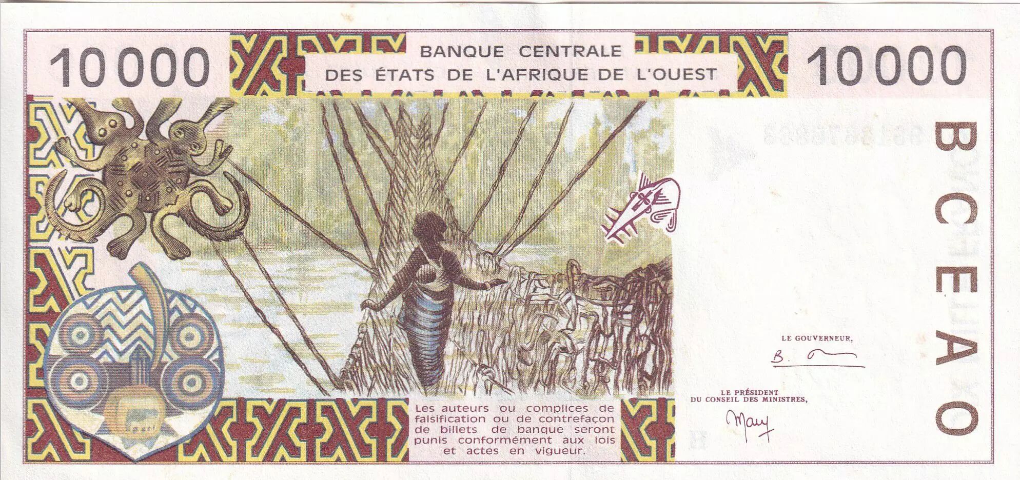 Accueil > Billets du Monde > Billets d'Afrique > Etats de l'Afrique de l'Ouest > BCEAO 10000 Francs - Pont de liane - 1998 - Lettre H (Maurtianie) - P.614Hf