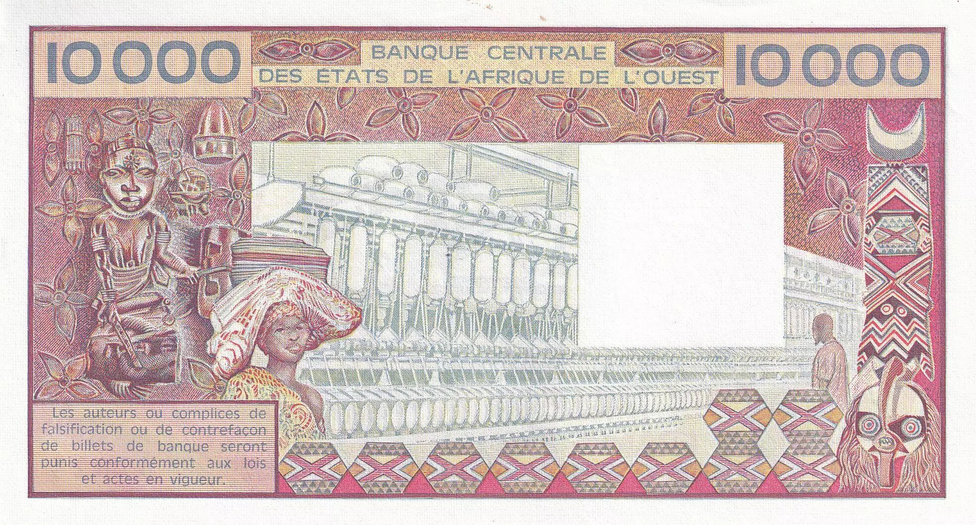 Accueil > Billets du Monde > Billets d'Afrique > Etats de l'Afrique de l'Ouest > BCEAO 10000 Francs - Tissage - ND (1986-1987) - Série O.032 - Lettre D (Mali) - P.408De