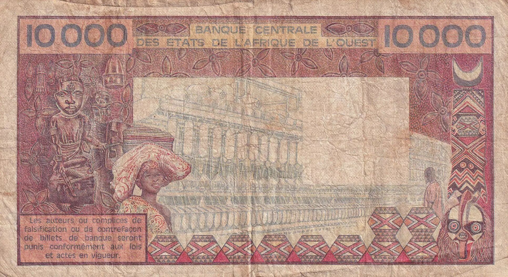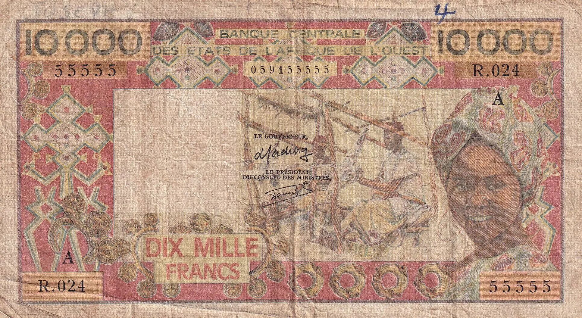 Billet BCEAO 10000 Francs - Tissage - ND (1989) - Série R.024 - Numéro 55555 - Lettre A (Côte d'Ivoire) - P.109Ag