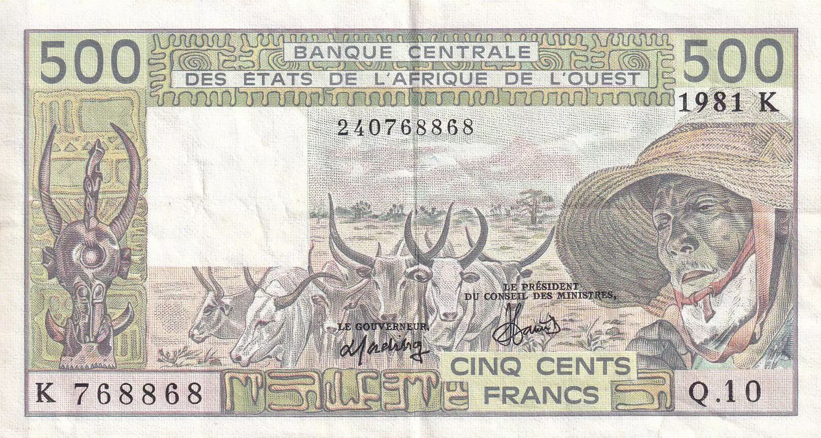 Billet BCEAO 500 Francs - Veil homme et zébus - 1981 - Lettre K (Sénégal) - Série Q.10 - P.706.Kc