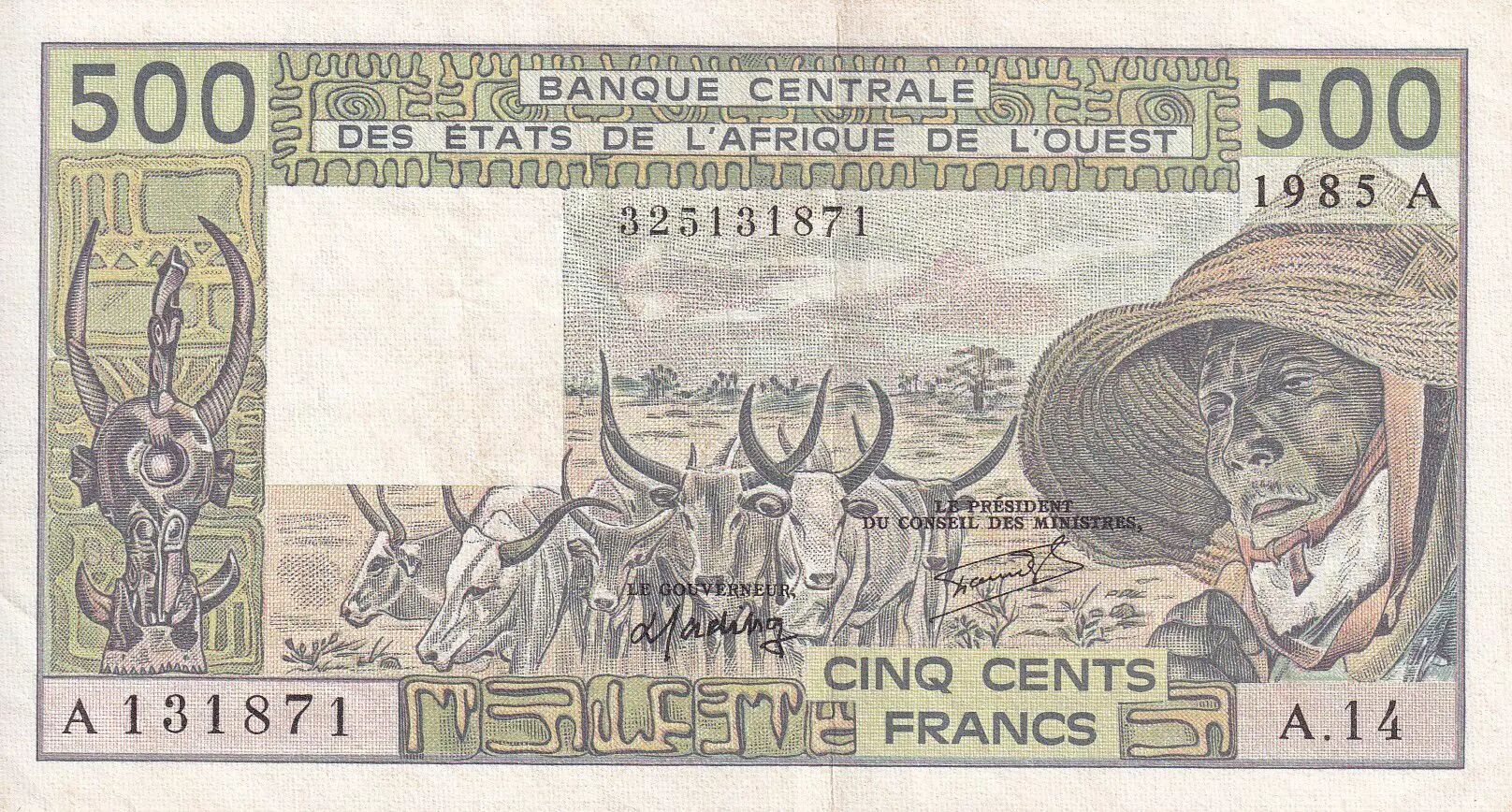 Billet BCEAO 500 Francs - Veil homme et zébus - 1985 - Lettre A (Côte-d'Ivoire) - Série A.14 - P.106Ai