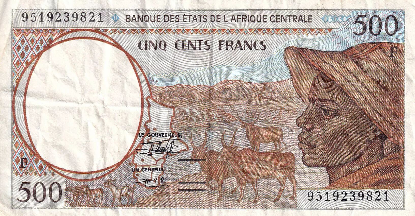Billet BEAC 500 Francs - Jeune homme - Zébus, antilopes - ND (1994) - F (Centrafrique) TTB - P.301Fc