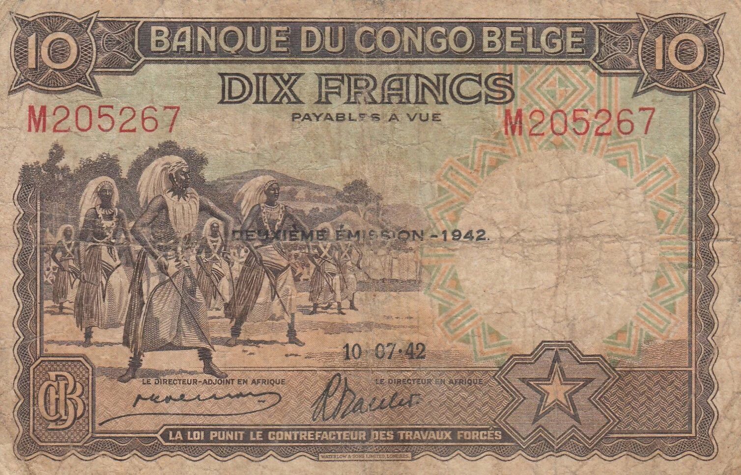 This 10 Francs banknote from the Belgian Congo, dated July 10, 1942, and bearing the series letter M, represents a specimen of the second issue of the year 1942.