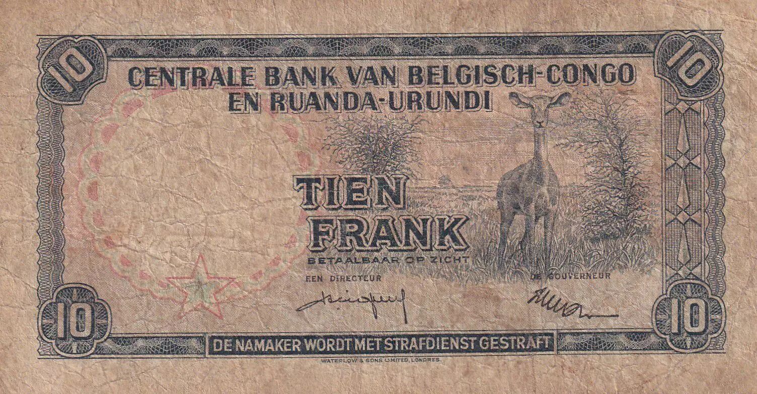 Home > > Belgian Congo 10 Francs - Soldier - Antelope - 01-03-1957 - Serial A.G - P.30b
