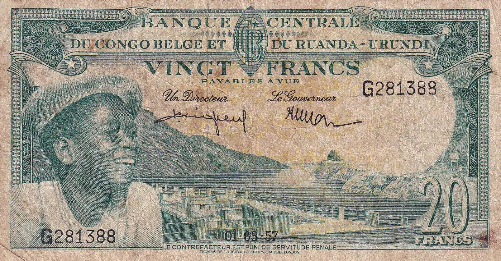 Banknote Belgian Congo 20 Francs - Boy and Dam - 01-03-1957 - Letter G - P.31