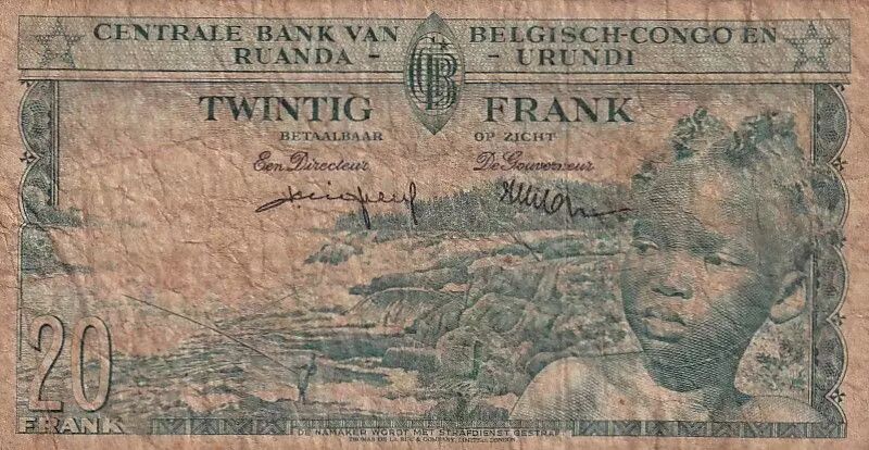 Banknote Belgian Congo 20 Francs - Boy and Dam - 01-08-1959 - Serial AU 925207