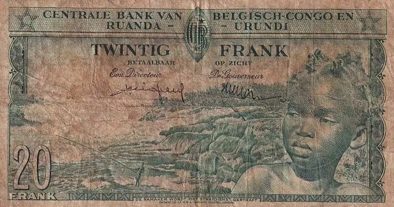 Banknote Belgian Congo 20 Francs - Boy and Dam - 01-12-1957 - Serial AG 036094