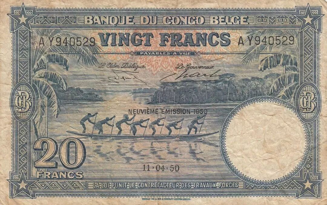 Banknote Belgian Congo 20 Francs - Pirogue and elephant - 11-04-1950 - Serial A.Y - P.15