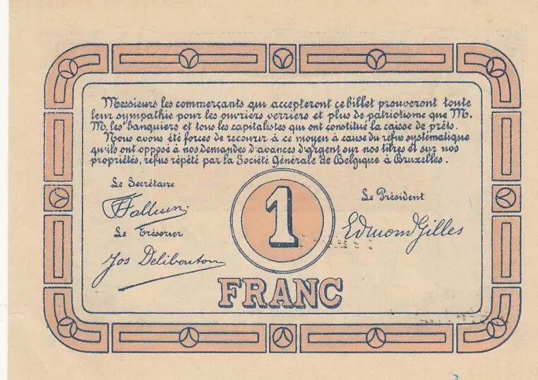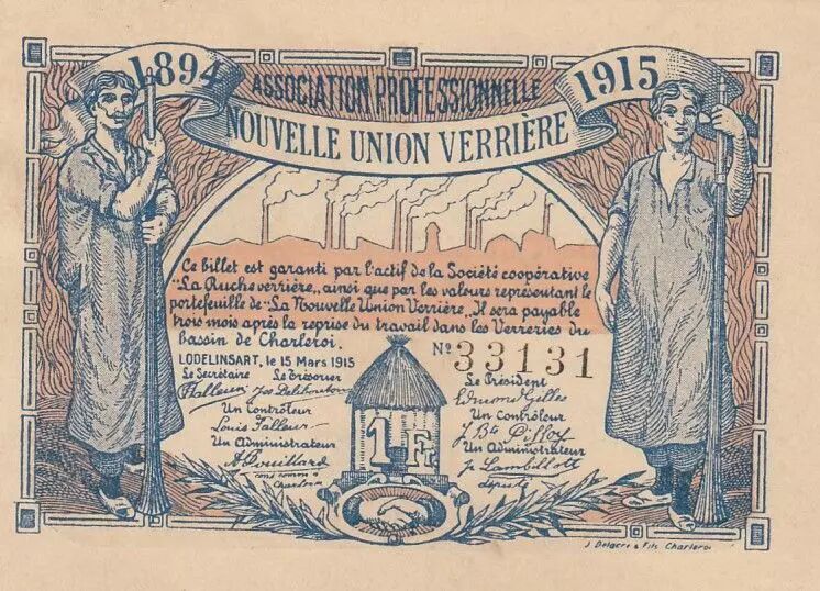 Billet Belgique 1 Franc - Nouvelle union verrière - 1915 - Billet de nécessité
