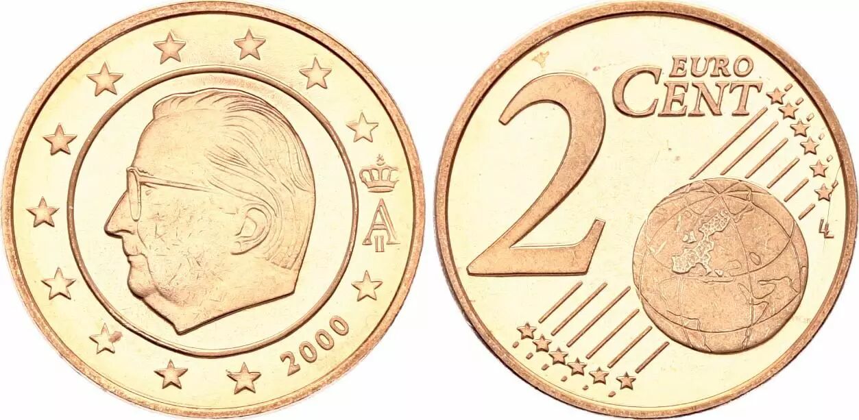 Cette pièce de 2 centimes d'euro a été émise par la Belgique en l'an 2000. Elle représente le roi Albert II.