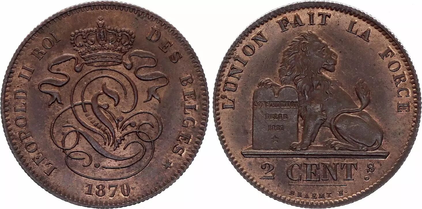 Pièce Belgique 2 Centimes Léopold II - Lion - 1870 - SPL