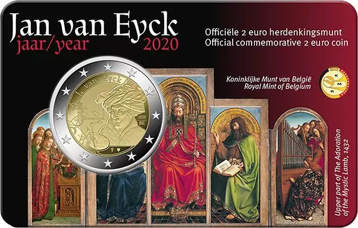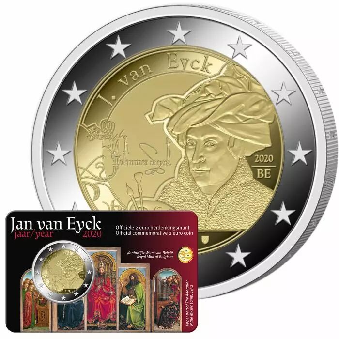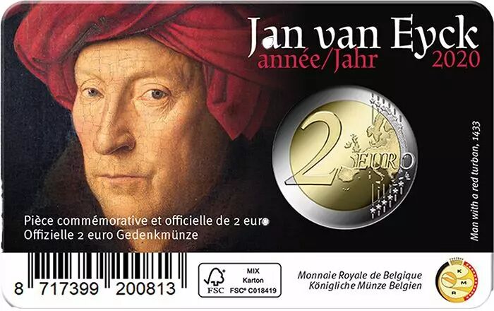 Cette nouvelle pièce belge reproduit une partie de « L'Homme au Turban Rouge » œuvre exposée à la National Gallery à Londres. Nombreux sont ceux qui le considére comme un autoportrait de Van Eyck. La composition est complétée par une palette de peintre et des pinceaux le signature originale du maître ainsi que son nom. La pièce est présentée dans une coincard décorée de l'autoportrait du peintre et d'un détail du retable de l'Agneau Mystique. Deux versions seront proposées : l'une en flamand et l'autre en wallon.