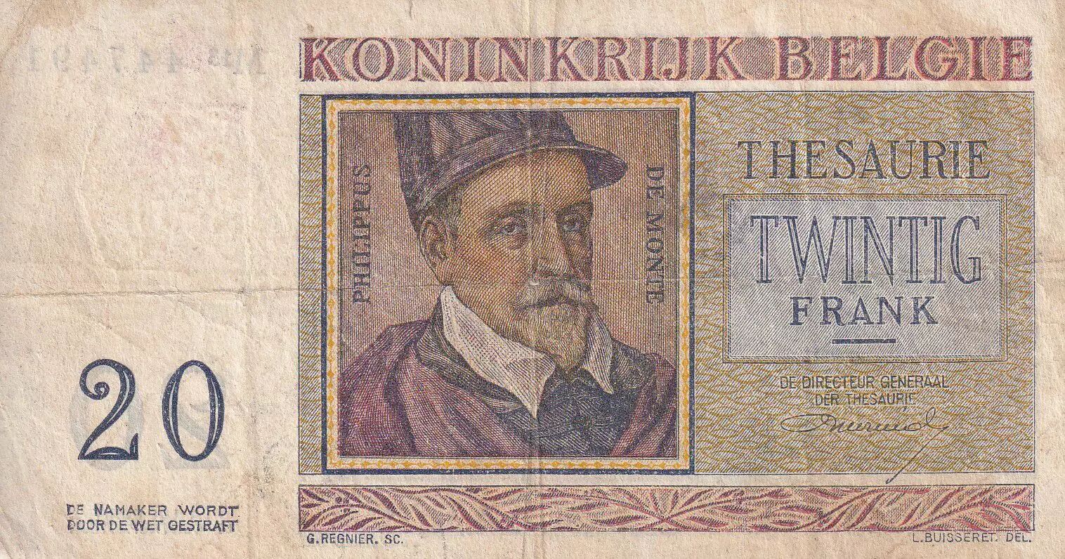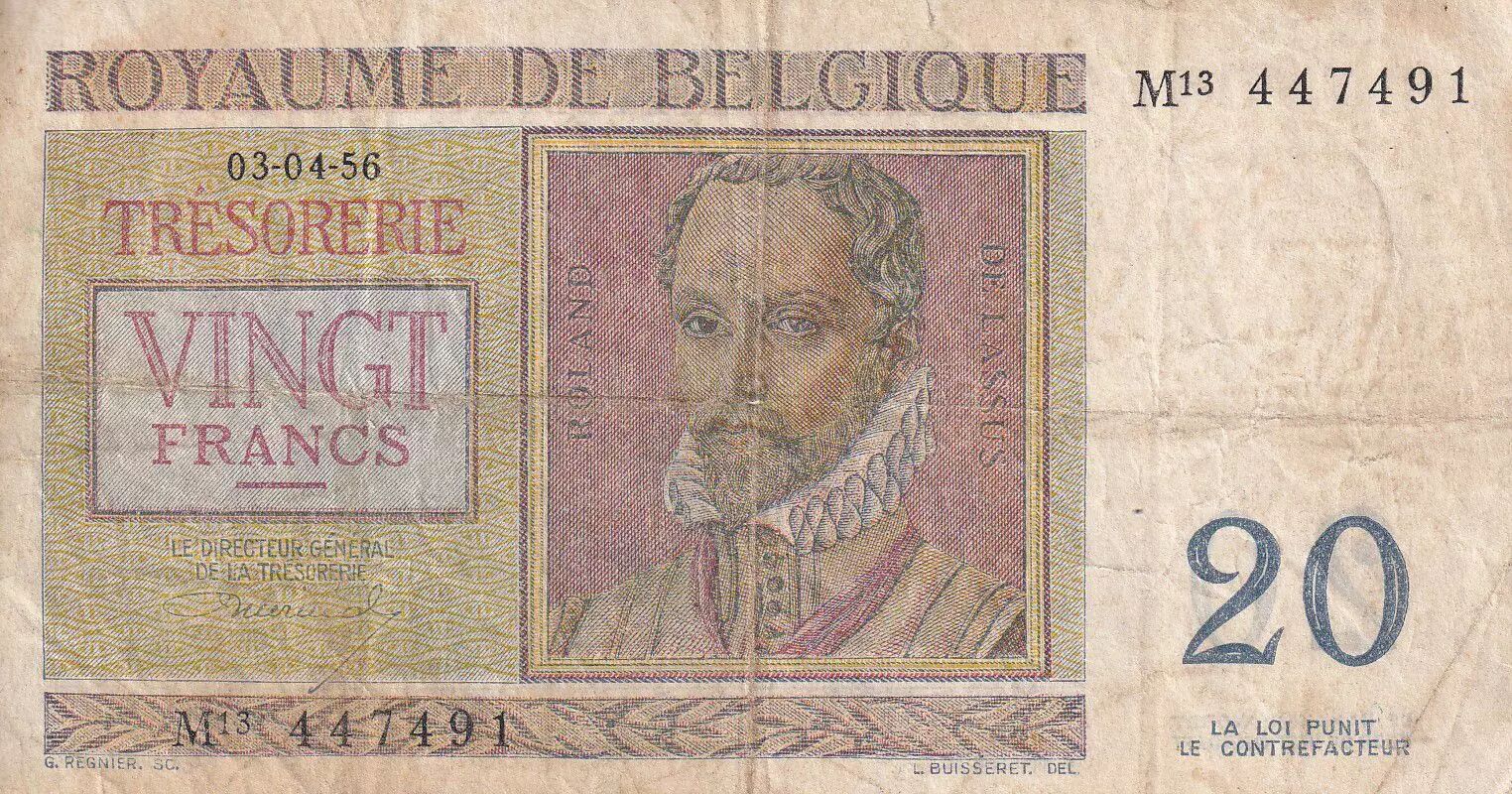 Accueil > Archivage > Belgique 20 Francs - Roland de Lassus - Philippus de Monte - 1956 - Série M.13 - P.132b