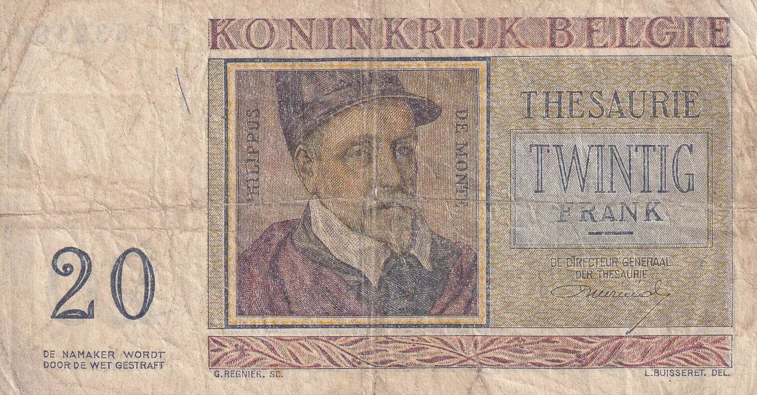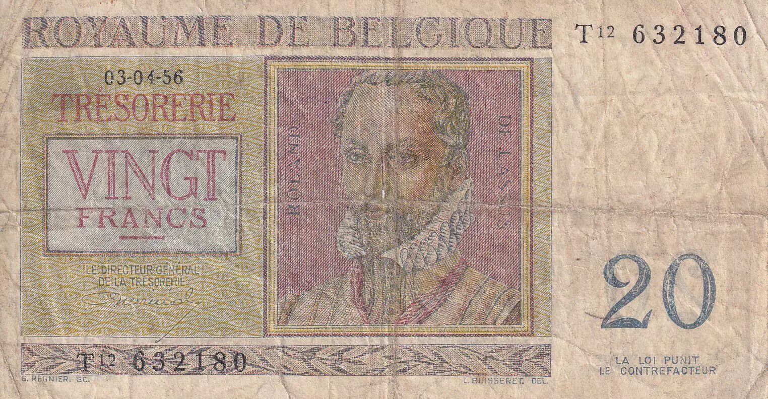 Accueil > Archivage > Belgique 20 Francs - Roland de Lassus - Philippus de Monte - 1956 - Série T.12 - P.132b