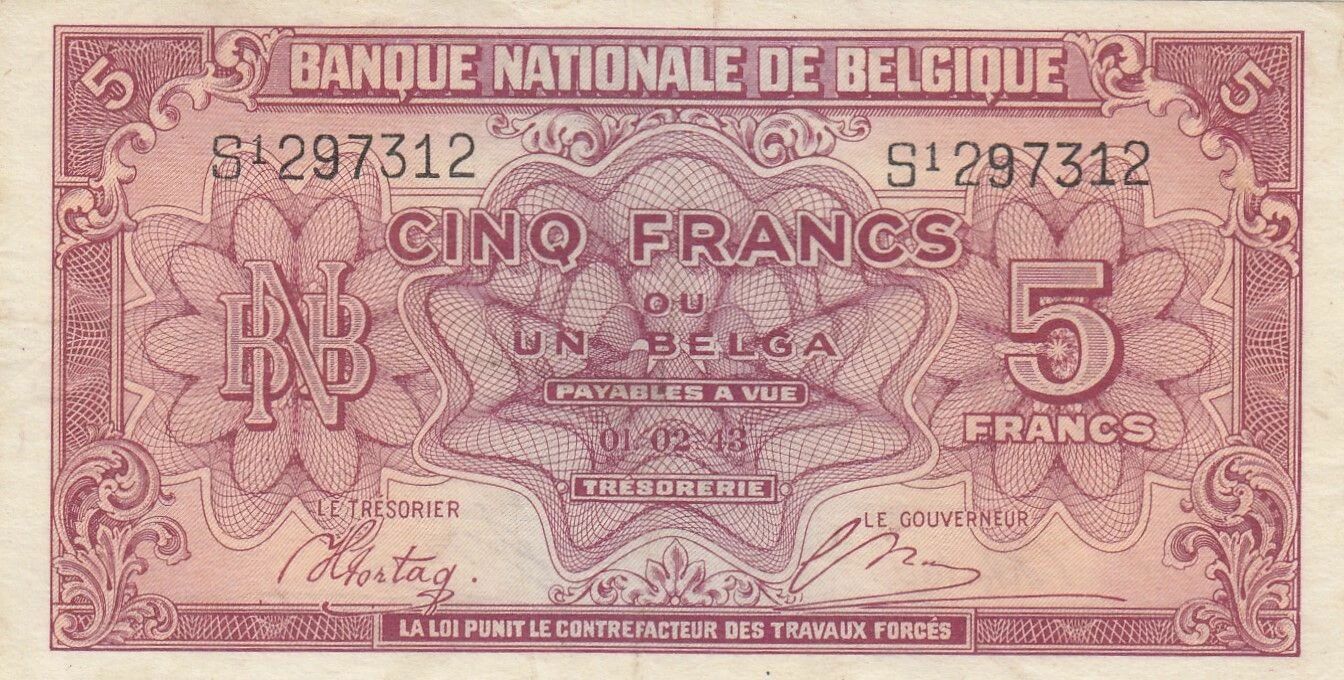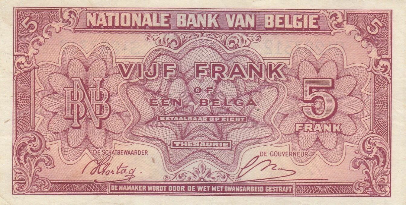 Ce billet de banque de Belgique, d'une valeur nominale de 5 francs, a été émis en 1943. Il se distingue par sa couleur rouge dominante, rehaussée par des nuances de rose et de bleu clair en arrière-plan. Le recto du billet présente une bordure décorative encadrant la dénomination, imprimée en latin. On y trouve également la mention de la Banque Nationale de Belgique, ainsi que la valeur nominale exprimée en francs et en belga. Une promesse de paiement à vue est inscrite, accompagnée d'un avertissement légal concernant la contrefaçon, passible de travaux forcés.