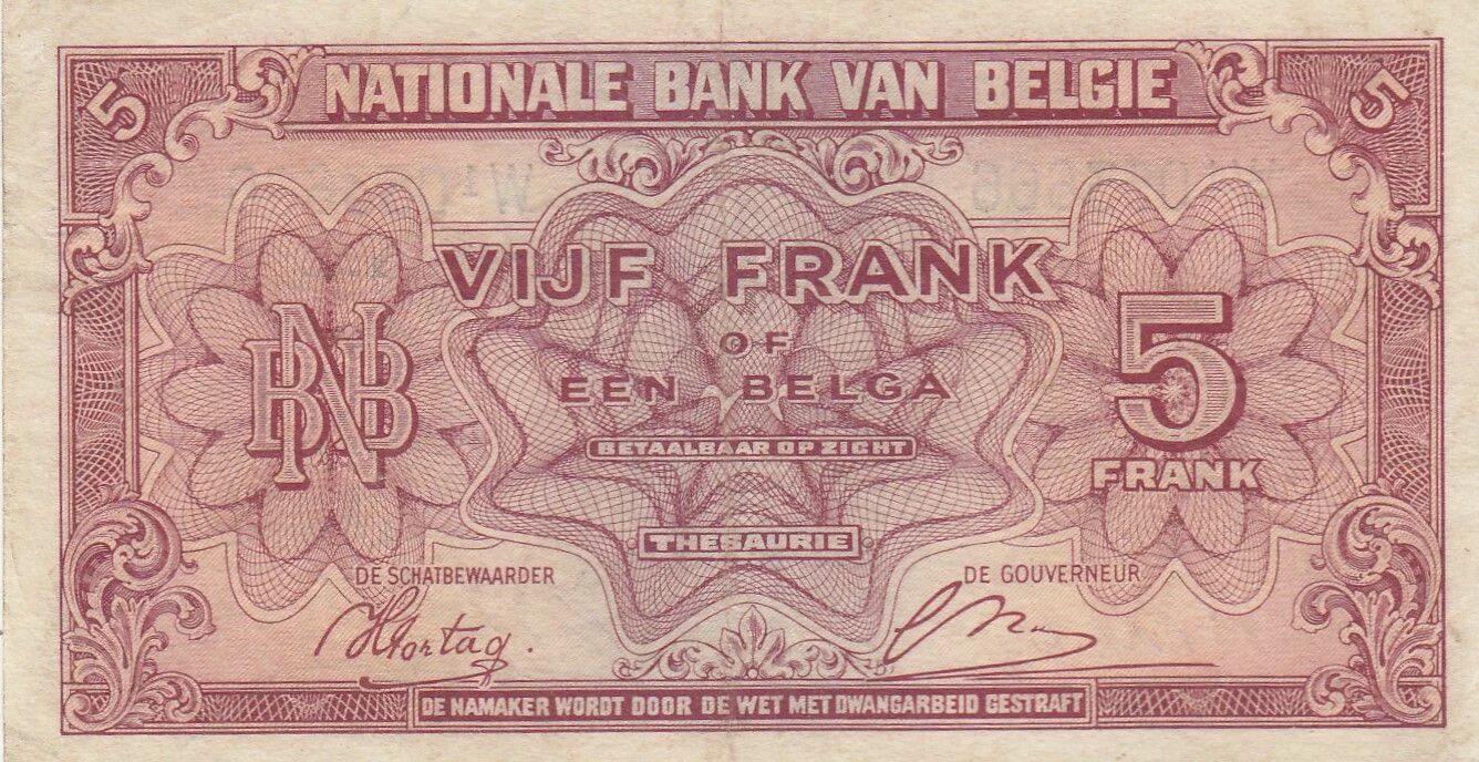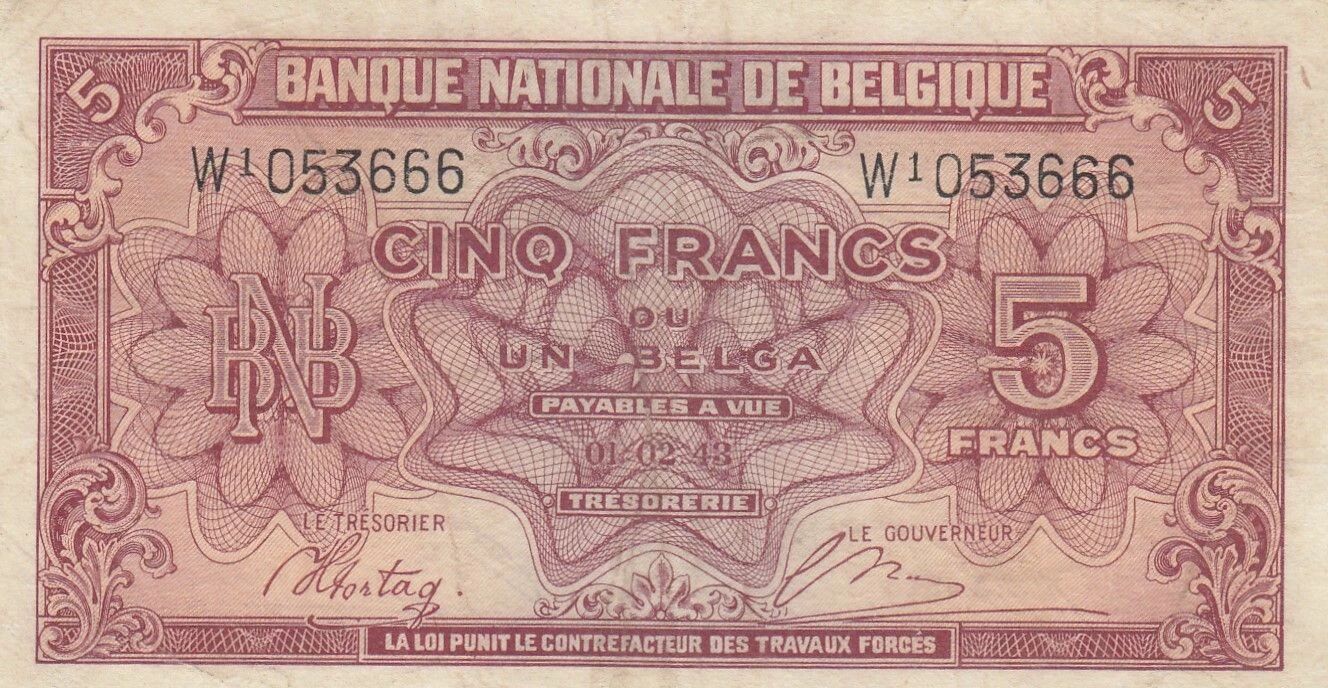 Ce billet de banque de 5 francs a été émis en Belgique en 1943. Il appartient à la série W1.