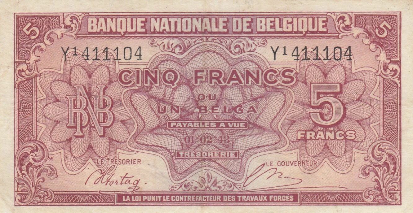 Ce billet de banque de 5 francs a été émis en Belgique en 1943. Il appartient à la série Y1. Le recto du billet présente un fond de couleur dominante rouge. Le numéro de série du billet est visible, ici 411104.